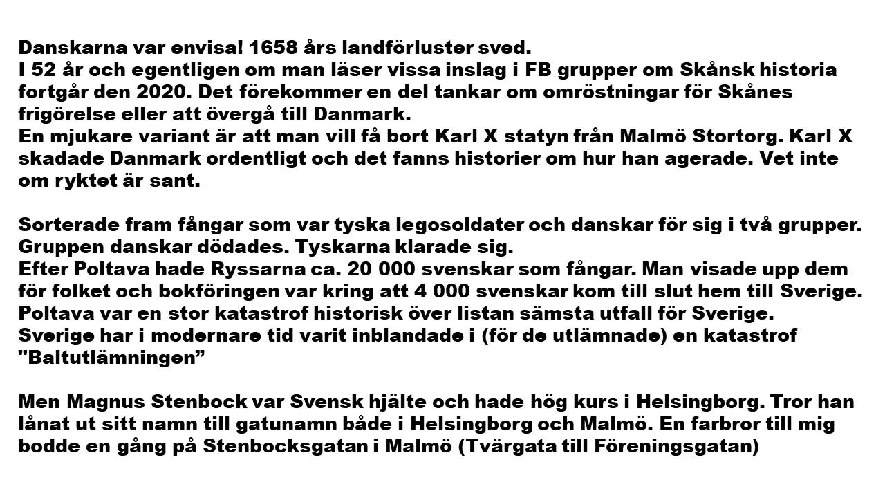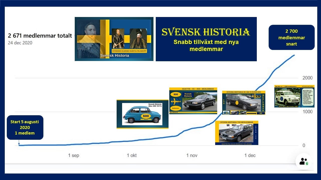 Facebook gruppen Svensk Historia öppnades i Augusti 2020 och fick snabbt 10 000 nya medlemmar. Här är 100 bilder från tidig verksamhet. Nu beräknas 18 000 poster finnas i gruppen, en stor mängd bra information om ämnet svensk historia. Sedan något år tvärstannade tillflödet med nya medlemmar och högsta nivån 10 295 är fallande och nu 10 148 medlemmar.