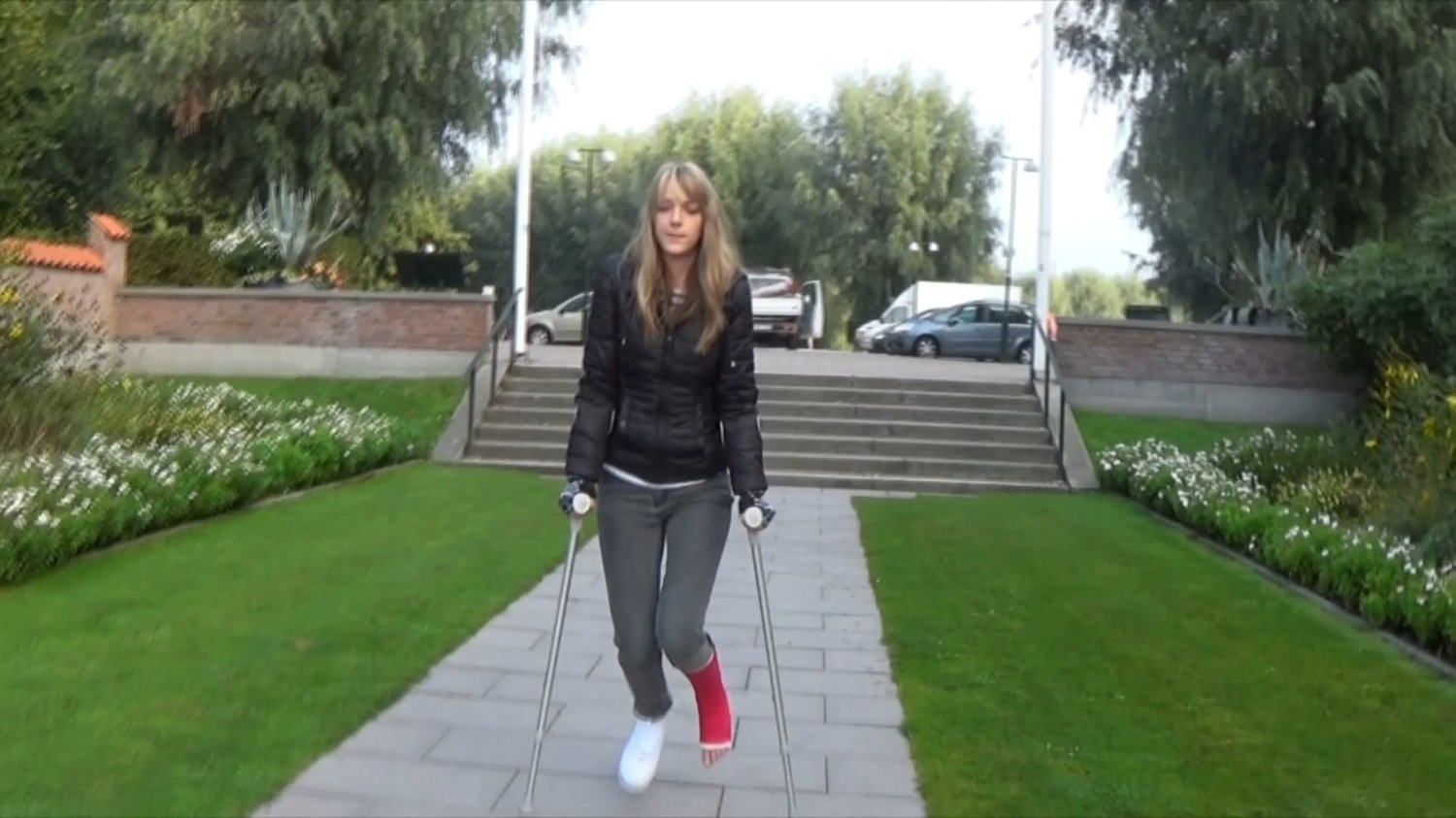 Simone is crutching in to the park. She is in a term red short leg cast. After some time she is crutching along the lake when she stops to rest and put her cated leg up on a crutch