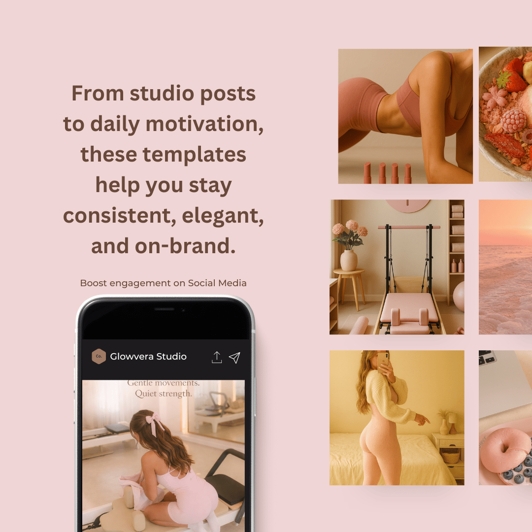 These templates help you maintain a soft, cohesive Pilates aesthetic — so your content feels aligned, intentional, and effortlessly beautiful.