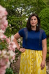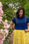 Pure Indigo sample is 44” / 110 cm shown on a 42” / 105 cm bust (two inches of ease) and Petal Party sample is 48” / 120 cm shown on a 42” / 105 cm bust (six inches of ease).