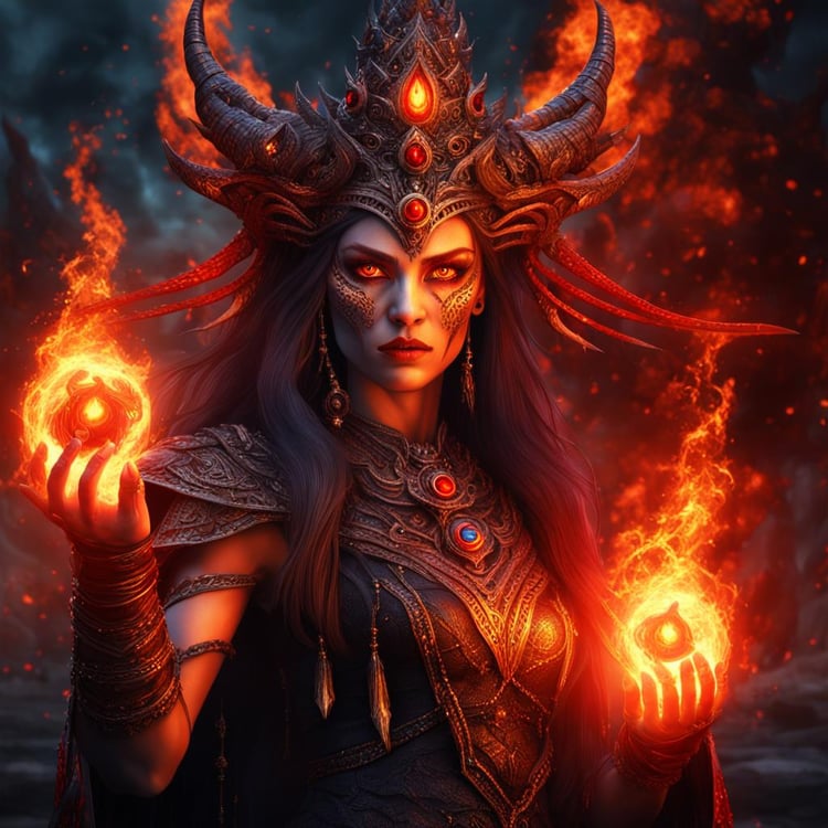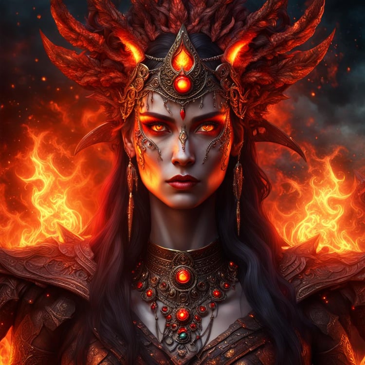 Unleash the fiery power of the "Majestic Fire Sorceress Queen," a photorealistic digital portrait that captures the intense gaze and commanding presence of a sorceress queen within the blazing confines of an Inferno Temple. This stunning artwork showcases the fire sorceress queen with glowing red eyes, exuding an aura of majesty and raw power.