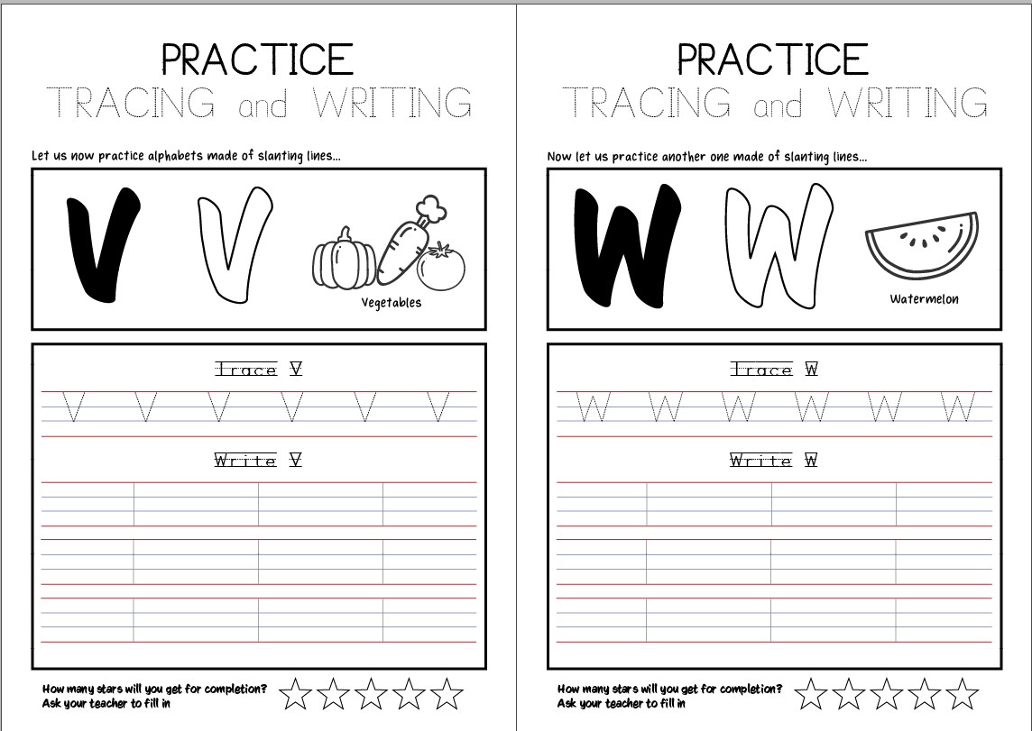 These worksheets are suitable for kindergarten kids who have learnt to identify alphabets and are beginning to write. The worksheets are arranged in a special order of difficulty following which kids can master easy strokes first and move on to more elaborate strokes.