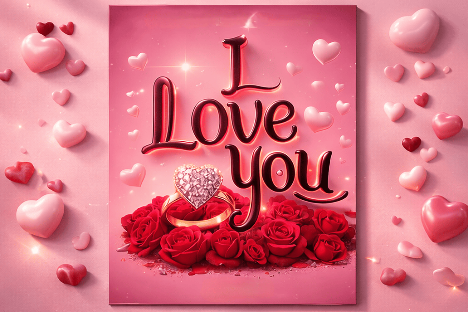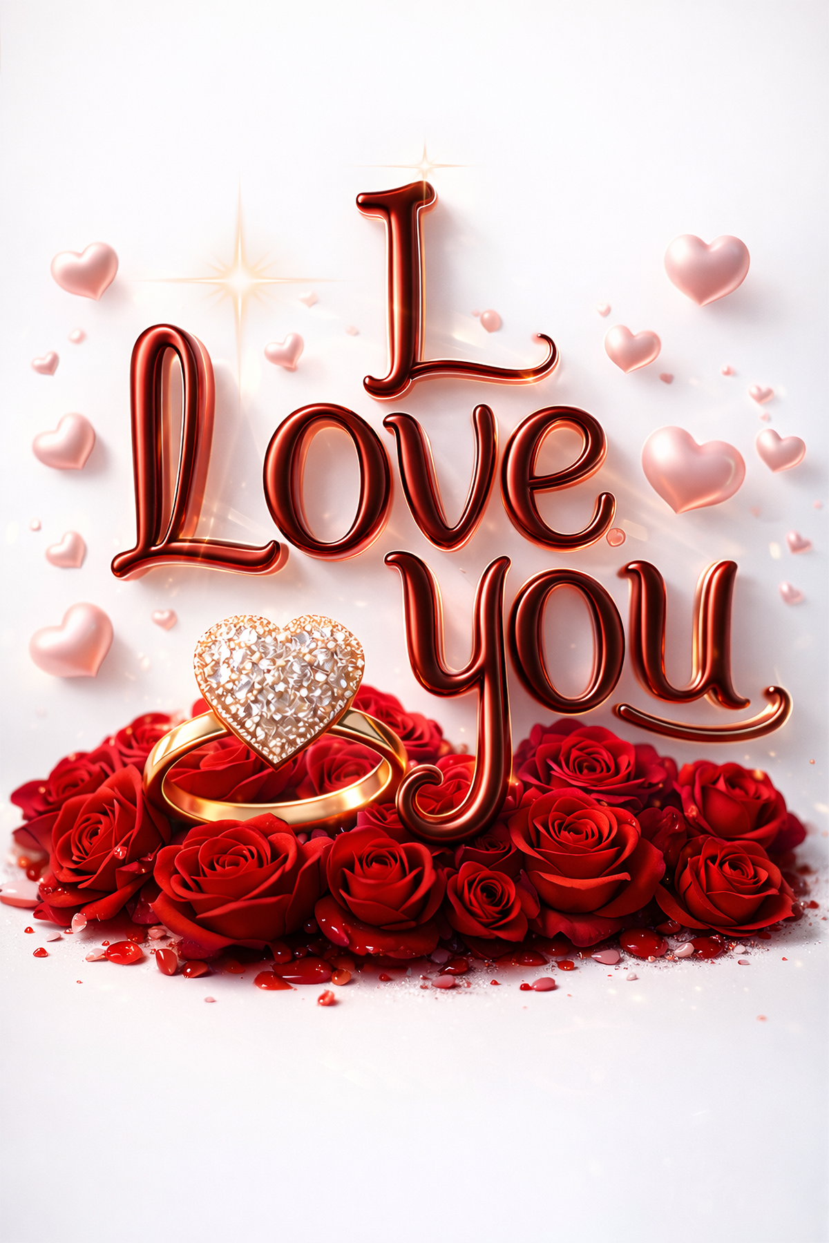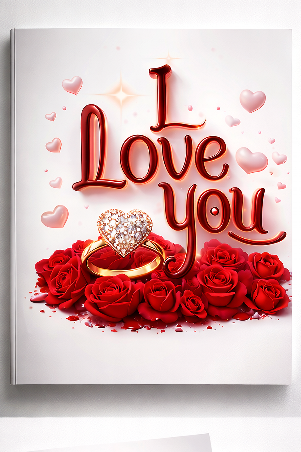 Make a bold, unforgettable statement of love with this ultra-romantic luxury artwork featuring sculpted red typography, a diamond-encrusted heart ring, and a bed of deep red roses. This piece blends elegance, passion, and timeless romance into a single breathtaking visual.