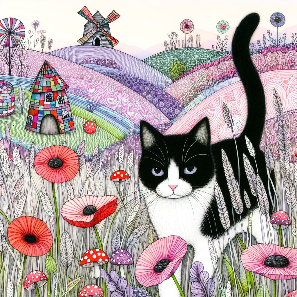 Black & white cat, playing on hills with poppies, daisies, & toadstools & sunflowers. is a wishing well & windmill.
