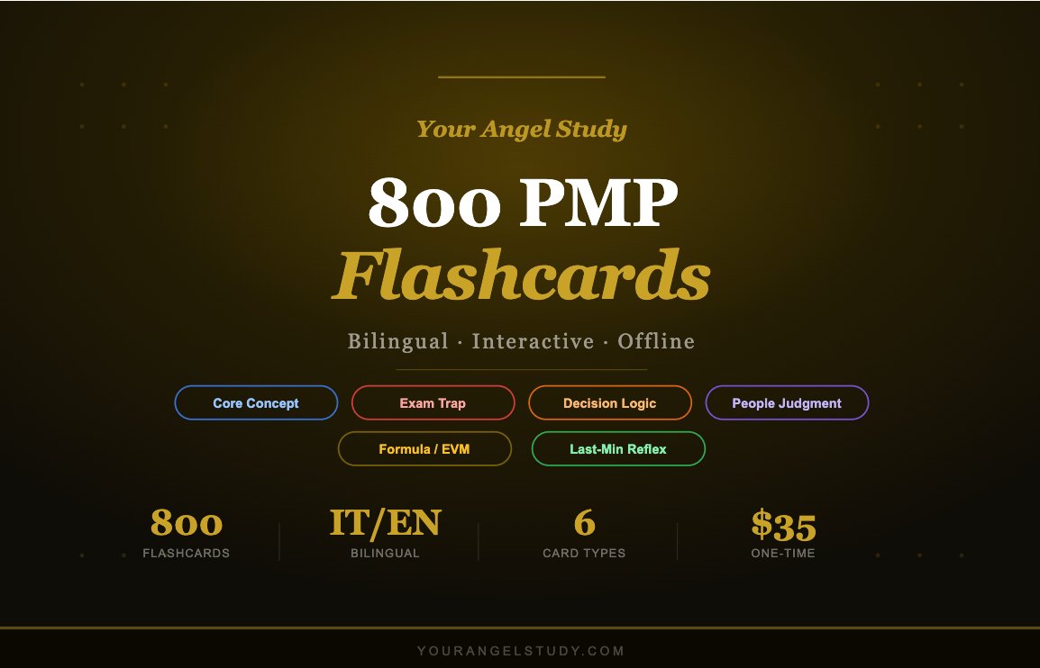 Your Angel Study è una risorsa indipendente per la preparazione agli esami, non affiliata né approvata dal Project Management Institute (PMI). "PMP," "PMBOK," e i relativi marchi sono di proprietà del PMI. Questo prodotto non garantisce il superamento di alcun esame di certificazione.