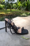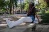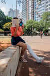 Flora changes her mini skirt for denim shorts and the sandals for all-star sneakers. Now feeling more confident, she walks without the help of crutches. Later, she changes her sneakers for a pair of sensual high heels, secured with a single black leather strap around her leg. She ends the day in São Paulo with a true exhibition session, showing off her beautiful feet, the sexy high heels, and the large cast that covers her entire leg.