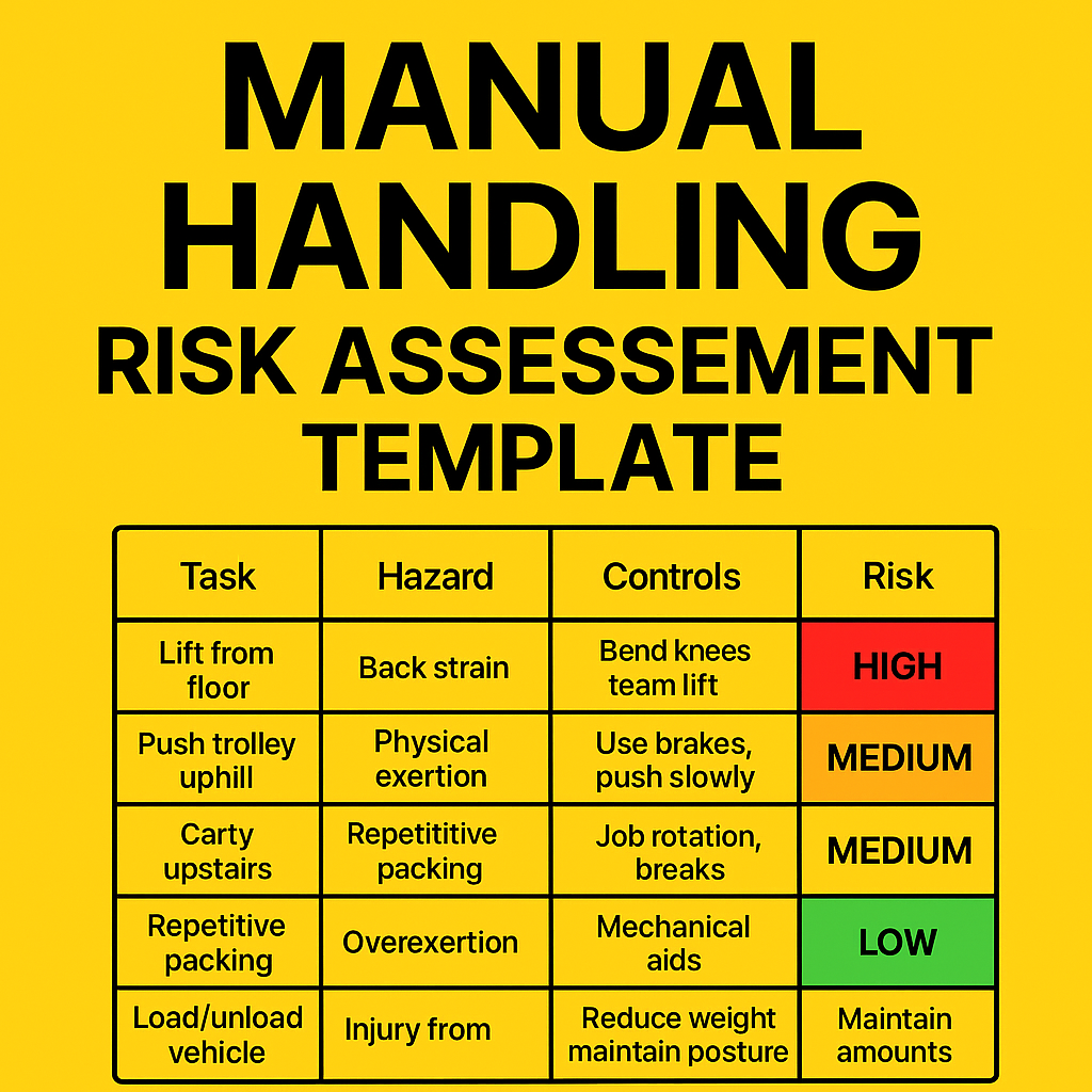 This ready-to-use Manual Handling Risk Assessment Template is built to align with HSE guidance and helps employers control lifting, carrying, and repetitive task hazards in the workplace. Featuring real-world examples and a colour-coded risk rating system, it's ideal for warehouse, logistics, and office environments.