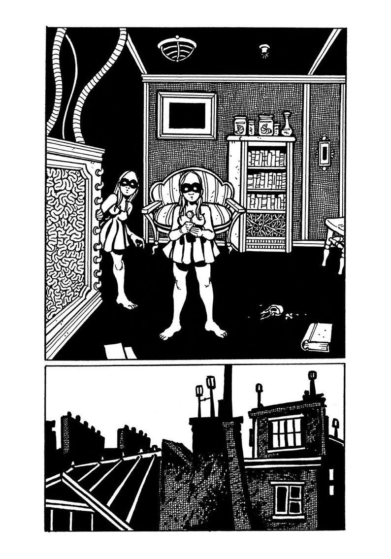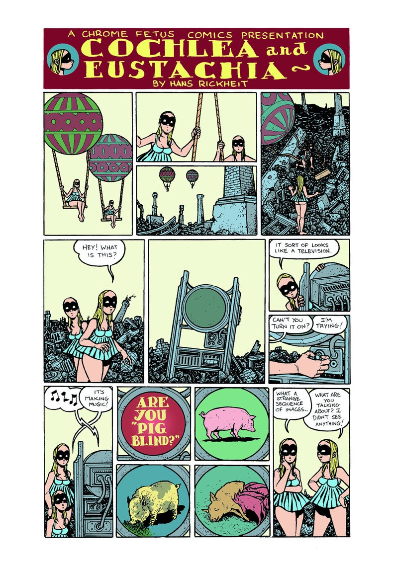 "Here are early stories by the graphic novelist whose work... comes closer than any other’s (except Nate Powell’s) to the prose stories of Zoran Živkovi, Andrew Crumey, Kelly Link, Ray Vukcevich, Theodora Goss, Benjamin Rosenbaum, and other practitioners of what’s been called slipstream fiction. They feature people, animals, and flesh-and-machine hybrids in all stages of development and dissolution, from fetus and pupa to suppurating near-corpse to skeleton . . . Among their protagonists, a bear-headed man in a long coat and high boots and identical teen sisters Cochlea and Eustachia, who wear only black masks and very short-skirted tops, recur often. Rescued from their original appearances in Rickheit’s slim, stapled-together Chrome Fetus Comics, these stories are less polished than his current stuff . . . but fully developed in every other aspect of his puzzling, engrossing, and disturbing storytelling." — Ray Olson, Booklist