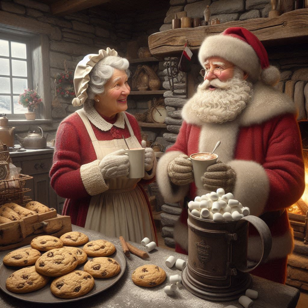 Santa and Mrs. Claus baking cookies and drinking hot cocoa with marshmellows.