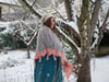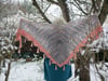 L’inspiration ne vient pas de très loin. Ce châle m’a tout simplement fait penser à une raie manta lorsqu’il est en cours de réalisation. C’est un très grand châle, exclusivement au point mousse qui joue avec les rayures, les matières et les rangs raccourcis.