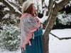 Puis la bordure de dentelle est entièrement relevée sur le V du châle, travaillée avec différents rangs raccourcis afin de donner de l’amplitude au châle sans l’approfondir, puis de créer ses jolies pointes.