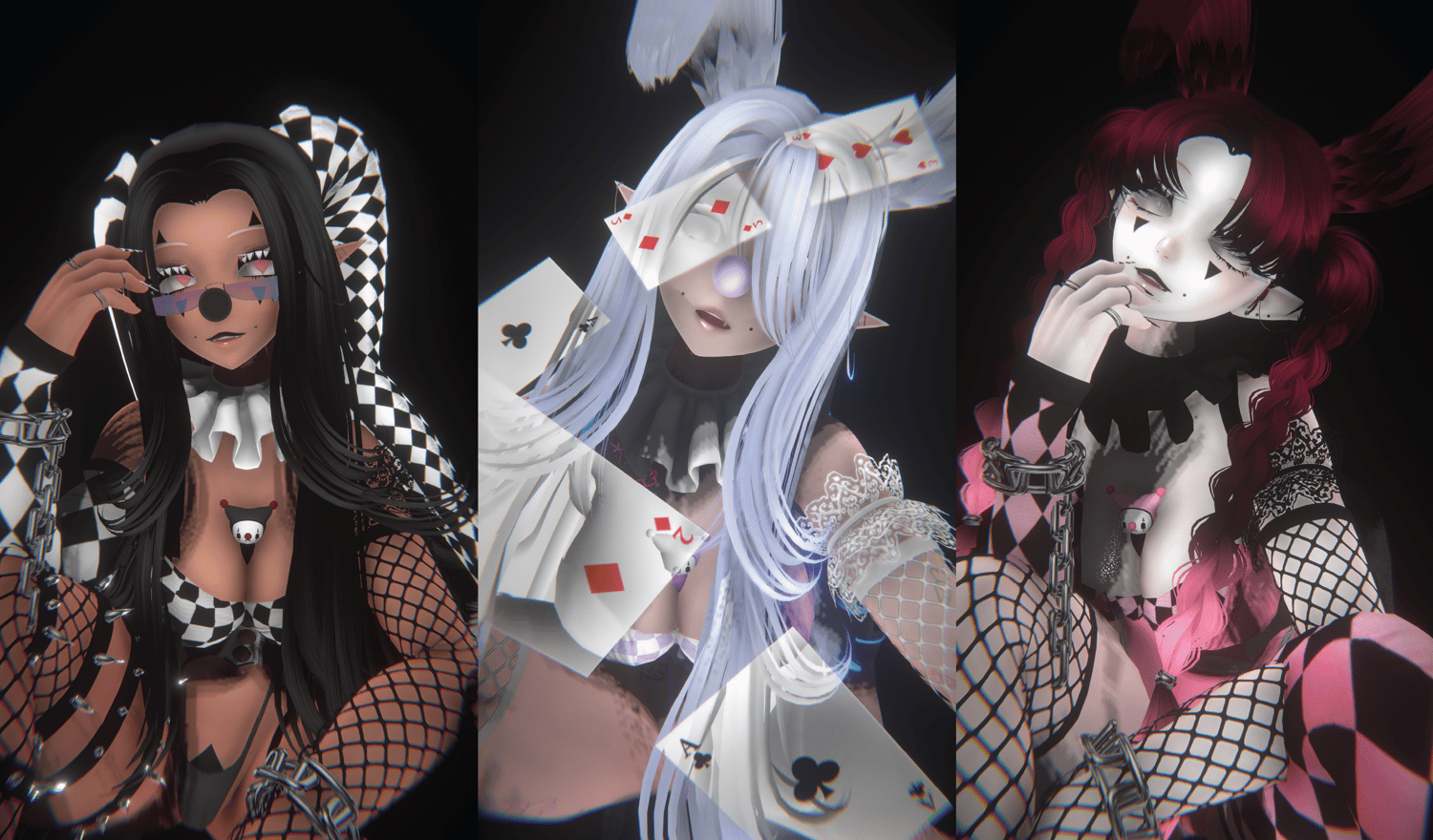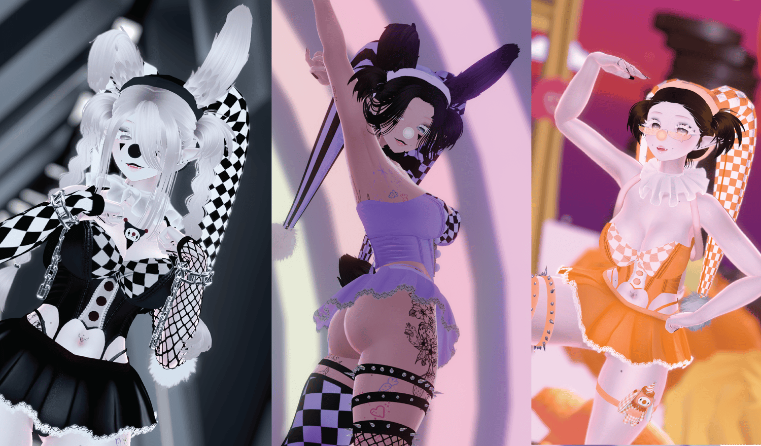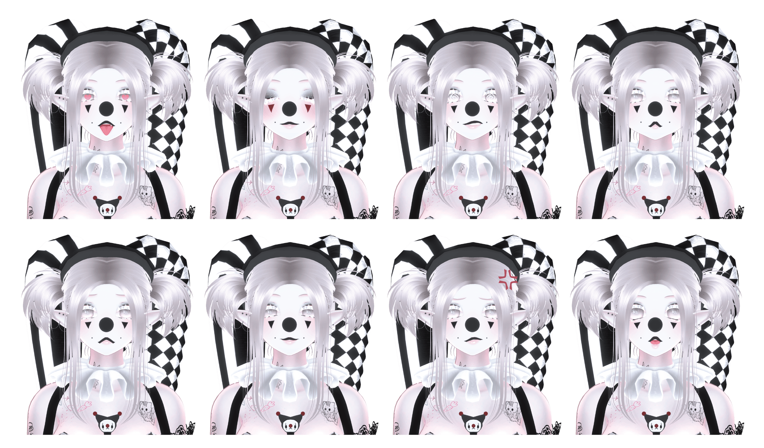 - Accessories: Hat | Ruffle Collar | Chains | Clown Nose | Backpack | Bunny Legs | Shoe Socks | Floating Cards | Glasses