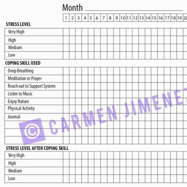 The monthly stress tracker is used to monitor your stress levels and use of coping skills daily. There are coping skills listed and room for you to add your own coping skills.