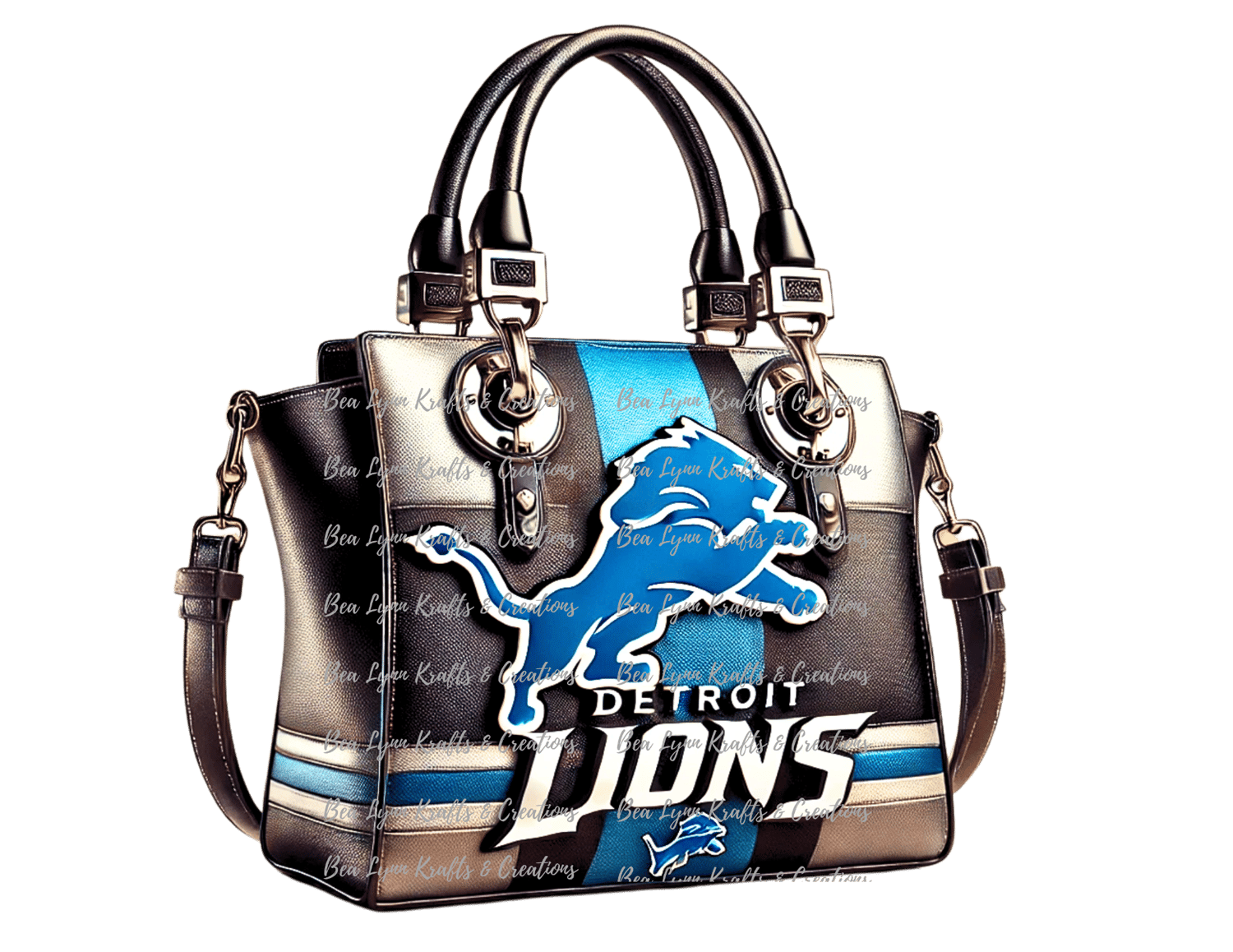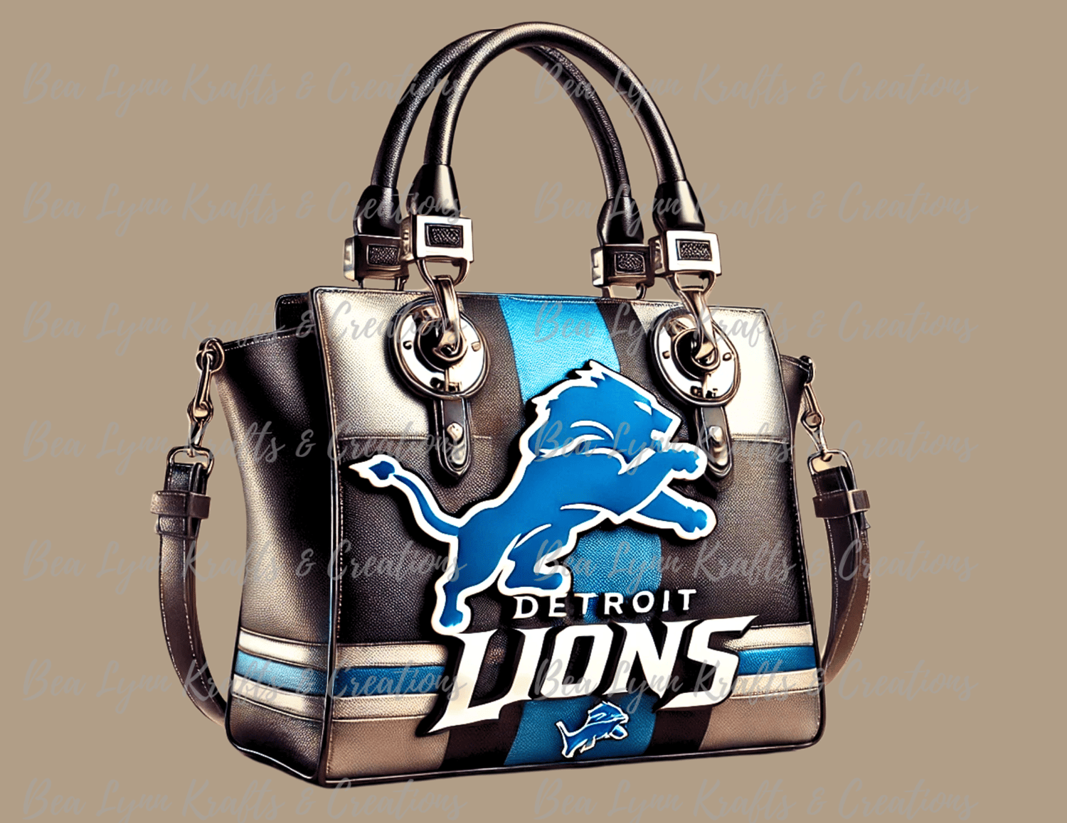 Show off your Detroit Lions pride in style with this bold and sophisticated handbag design! Featuring the iconic Lions logo in striking blue, silver, and black, this fashionable accessory is perfect for fans who want to carry their team spirit everywhere they go. With sleek detailing and a dynamic, sporty flair, this design is a must-have for die-hard Lions fans looking to add a touch of elegance to their game-day look.