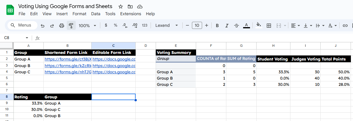 This is the sample spreadsheet showing how to calculate voting results using Google Forms and Sheets. Please see this blog post: Voting Using Google Forms and Sheets for a detailed explanation on how it was made.
