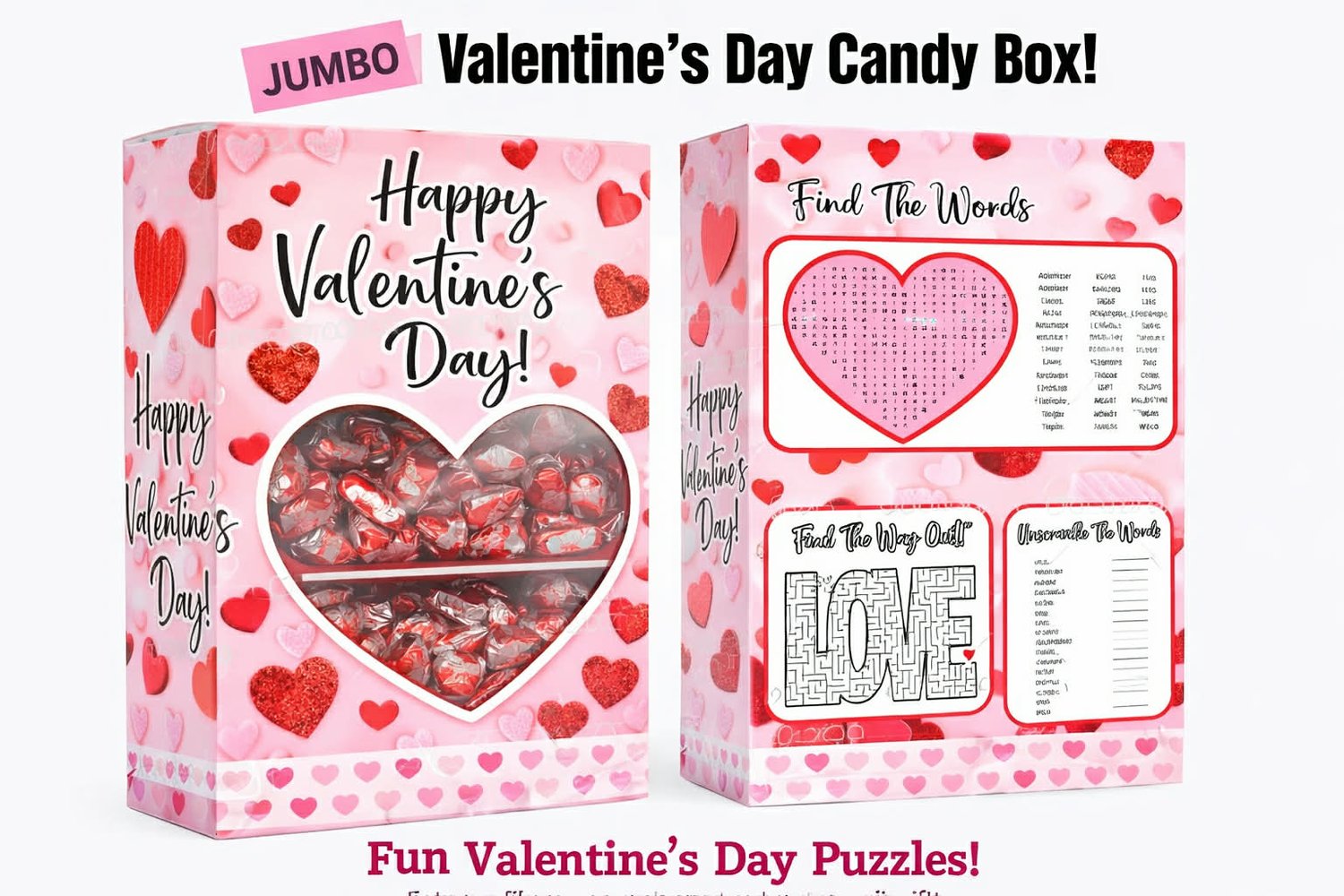 Create the cutest Valentine’s Day treat box with this easy-to-use jumbo printable template! Designed with bright pinks, hearts, puzzles, and a heart-shaped window, this template is perfect for school gifts, parties, and DIY candy boxes.