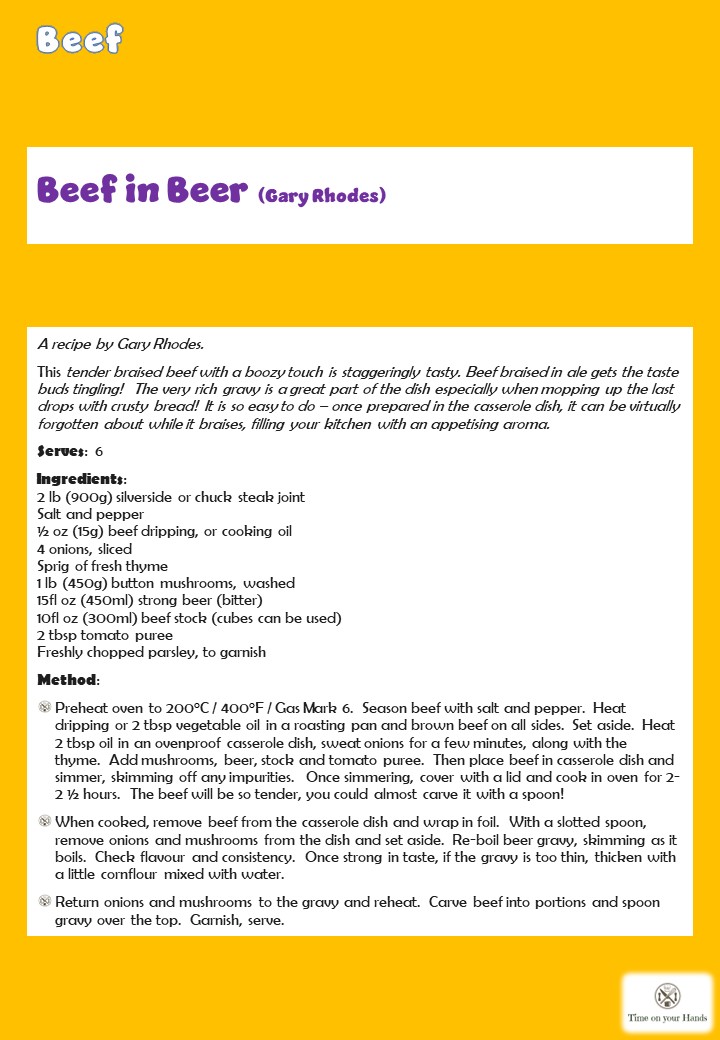 This selection of recipe cards for Beef recipes have been taken from the Time on your Hands blog which was started in 2012.
