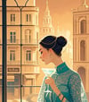 The woman’s posture and profile evoke the charm of classical portraiture, while also hinting at a narrative—perhaps a quiet moment of reflection in a luxurious café. The detailed cityscape outside the window adds depth, transporting the viewer to a serene European afternoon.