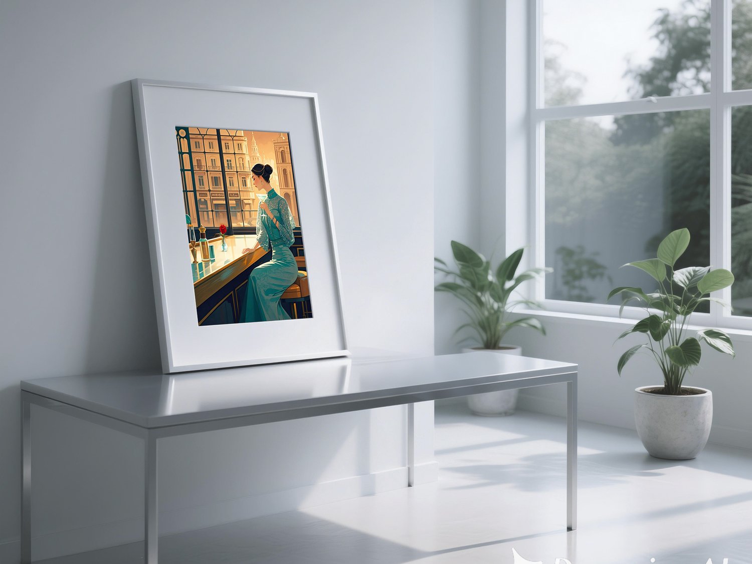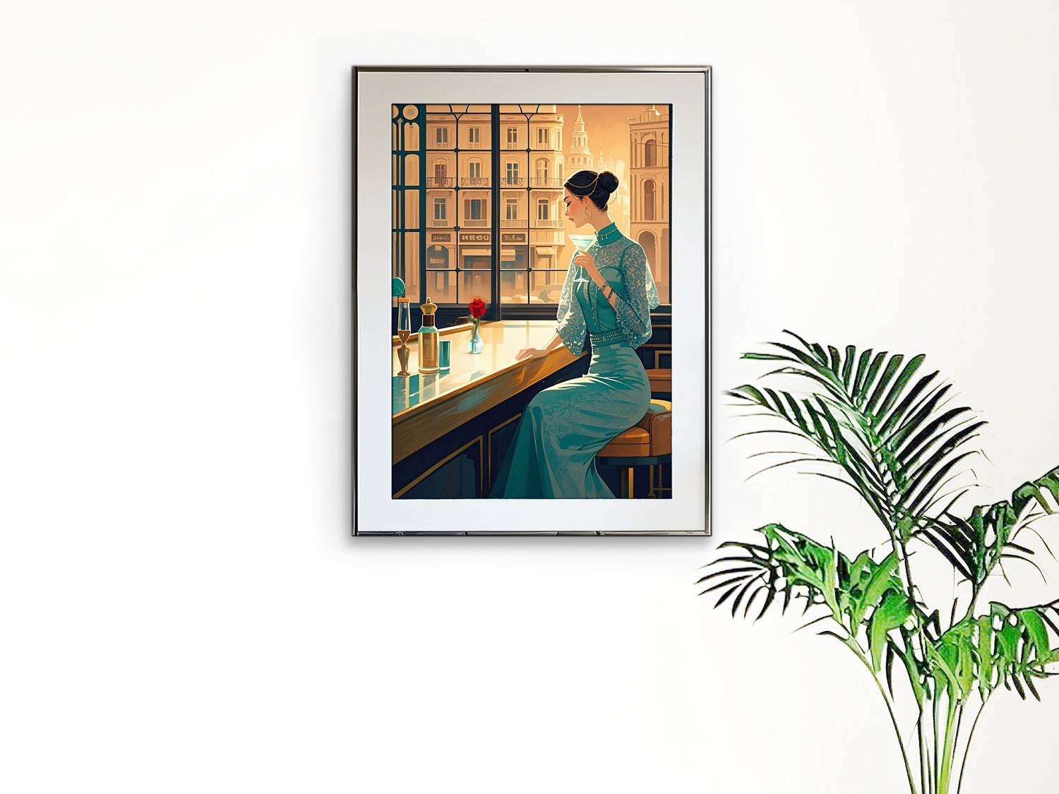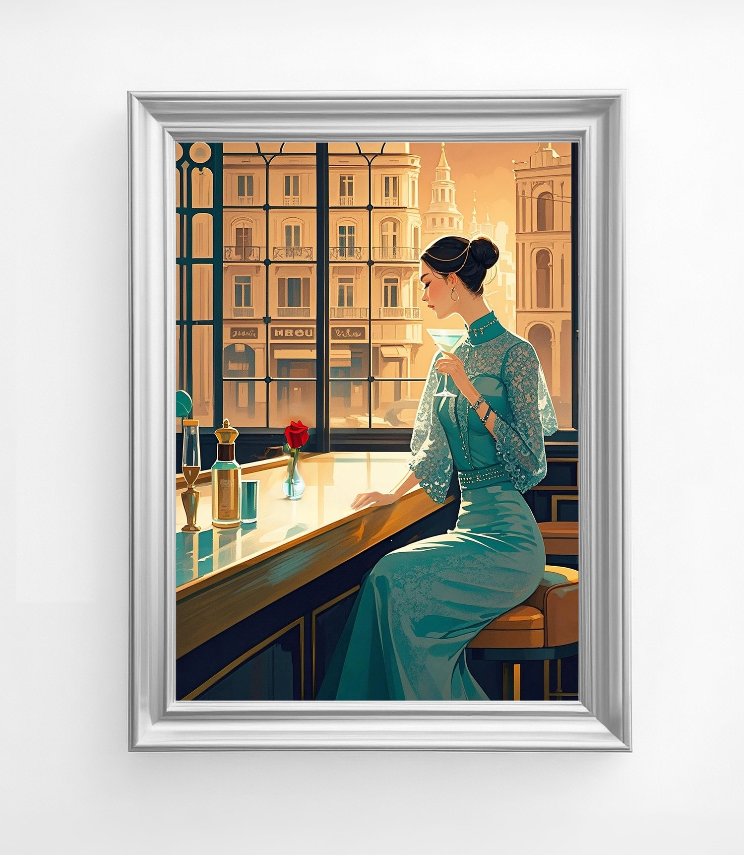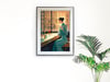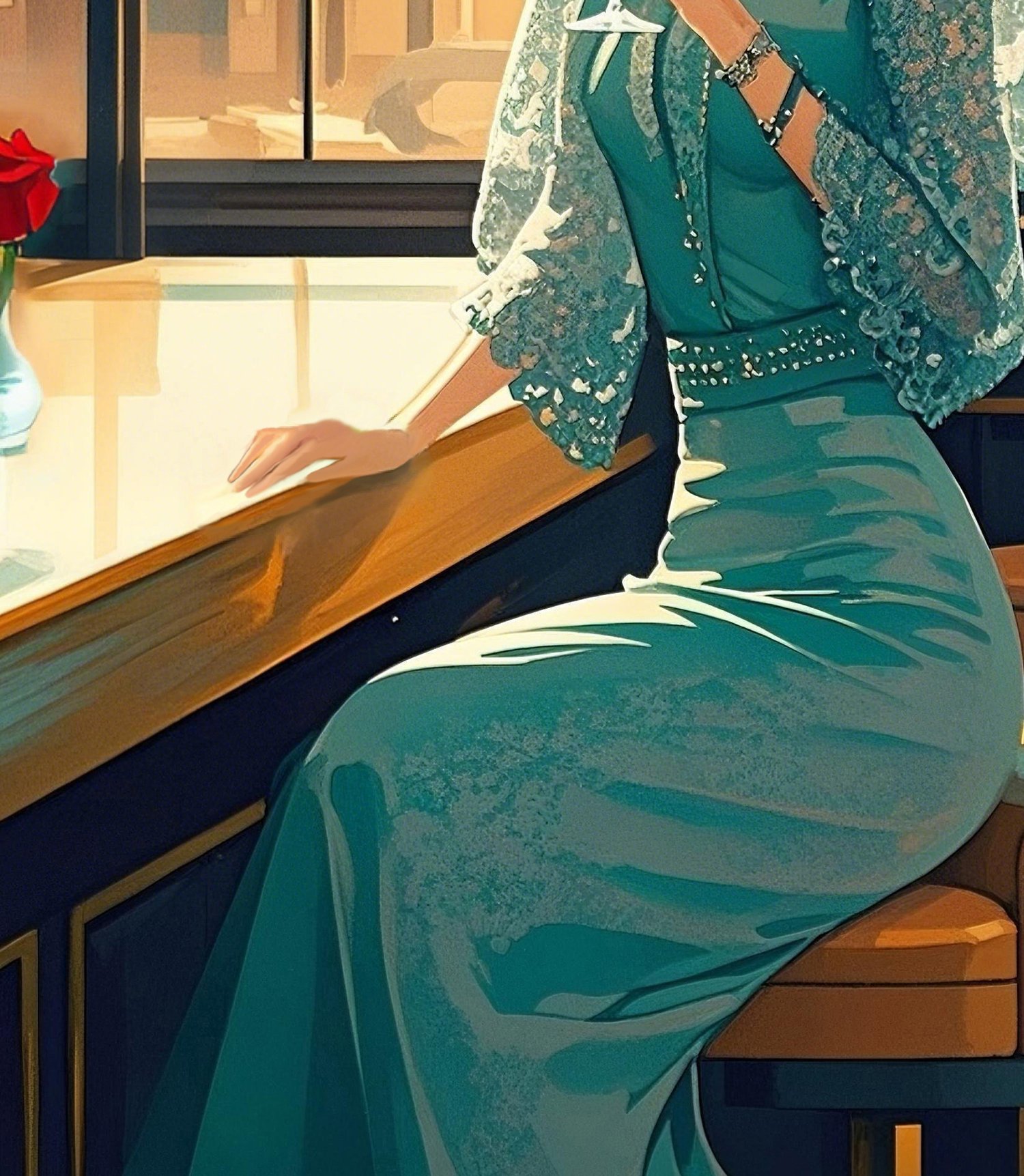 This piece exudes a refined elegance with a style reminiscent of Art Deco and retro-modern aesthetics. The warm-toned sunlight streaming through the large windows beautifully contrasts with the cool teal of the woman’s dress, creating a harmonious yet striking visual balance.