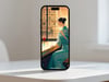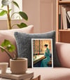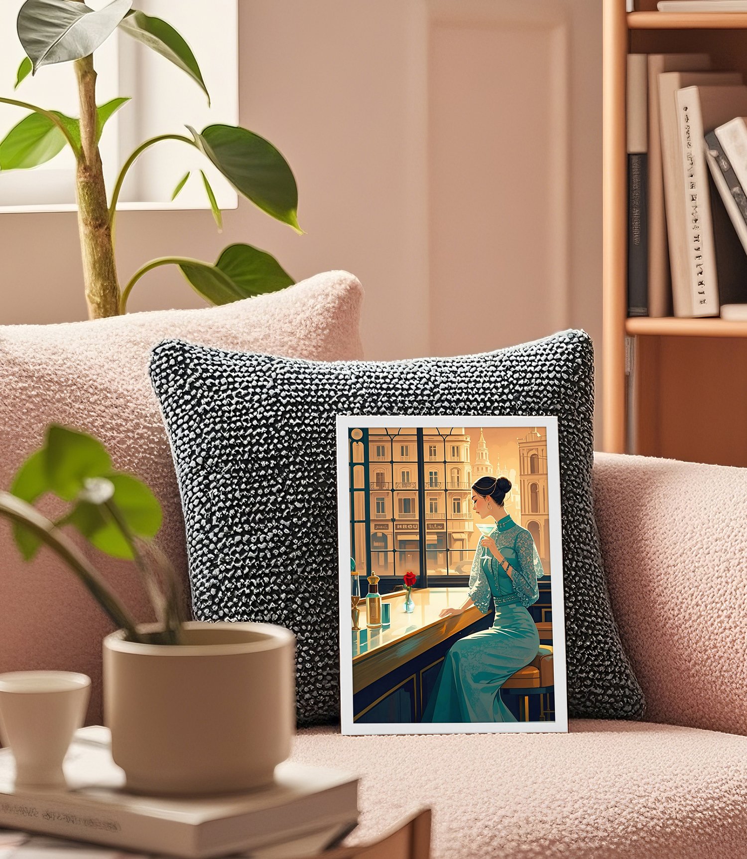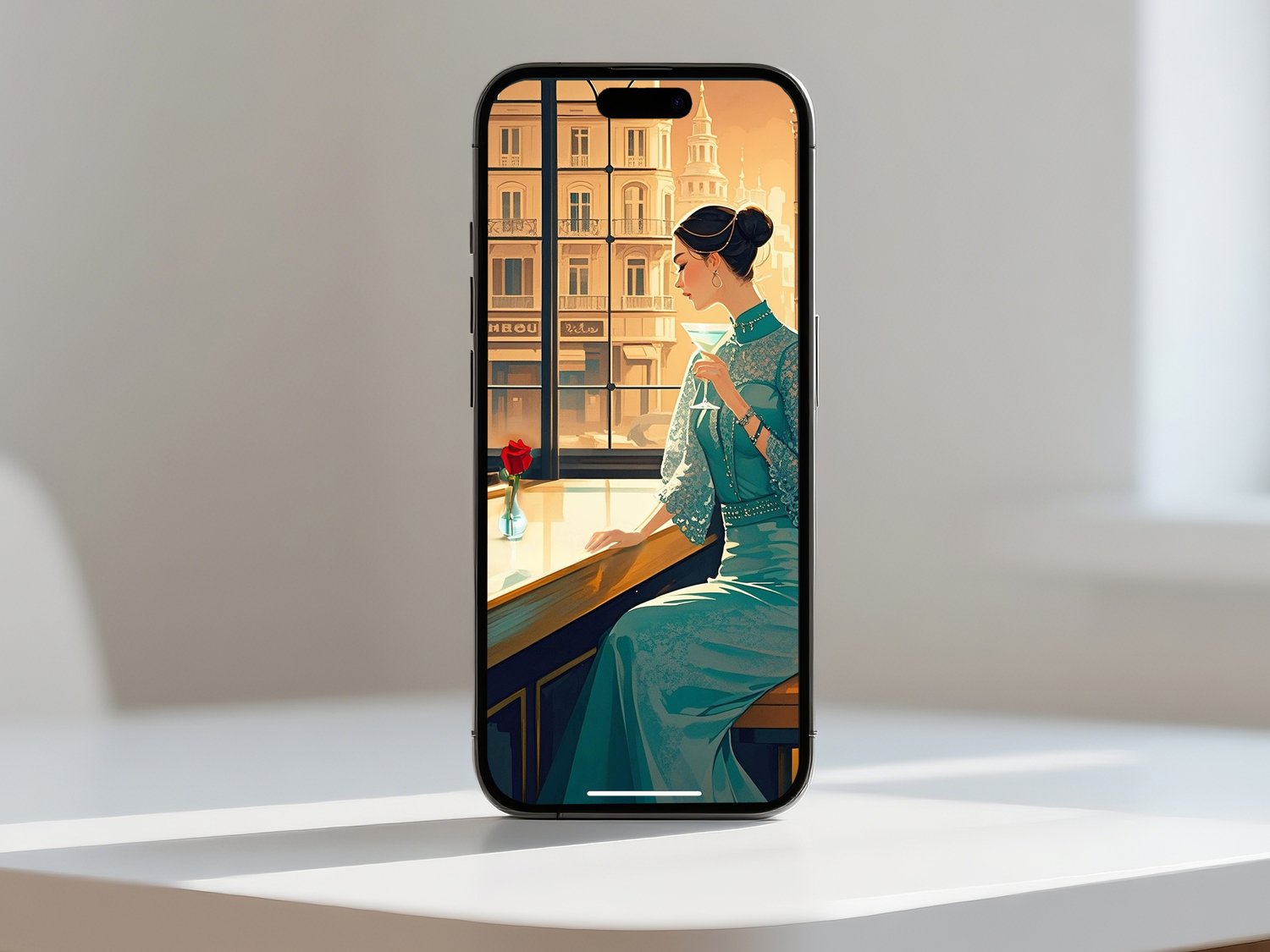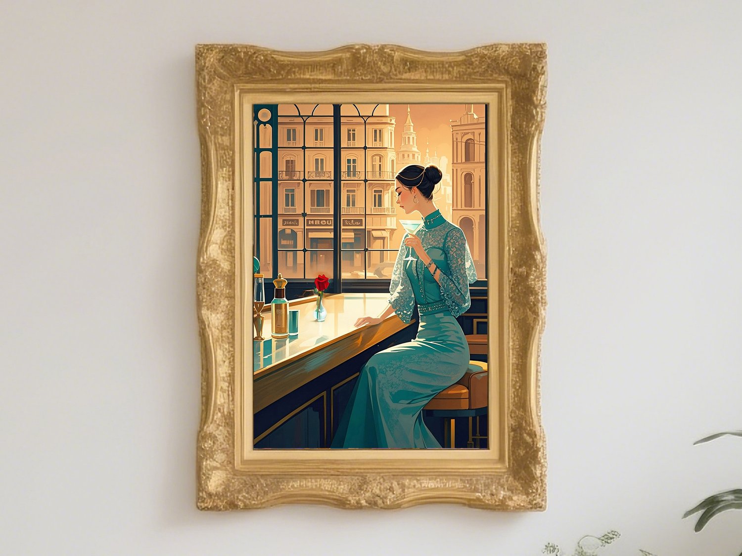 This piece exudes a refined elegance with a style reminiscent of Art Deco and retro-modern aesthetics. The warm-toned sunlight streaming through the large windows beautifully contrasts with the cool teal of the woman’s dress, creating a harmonious yet striking visual balance.