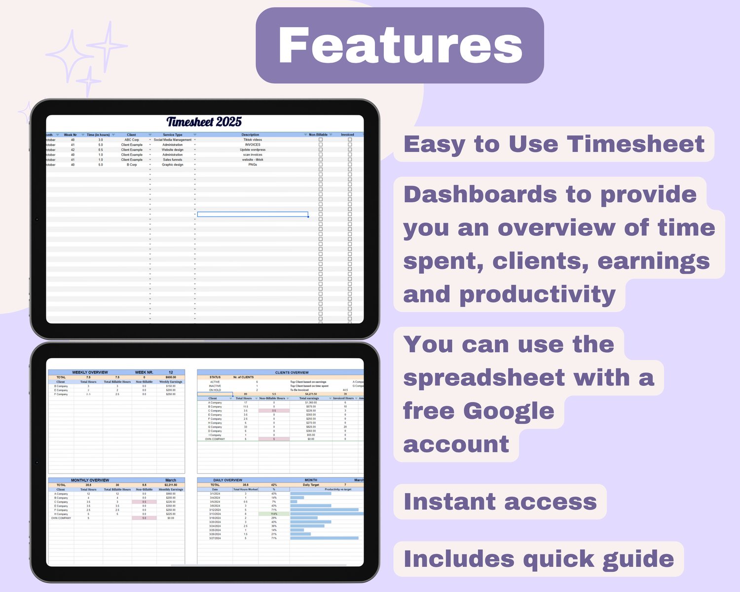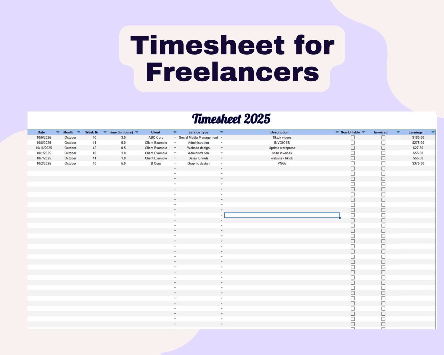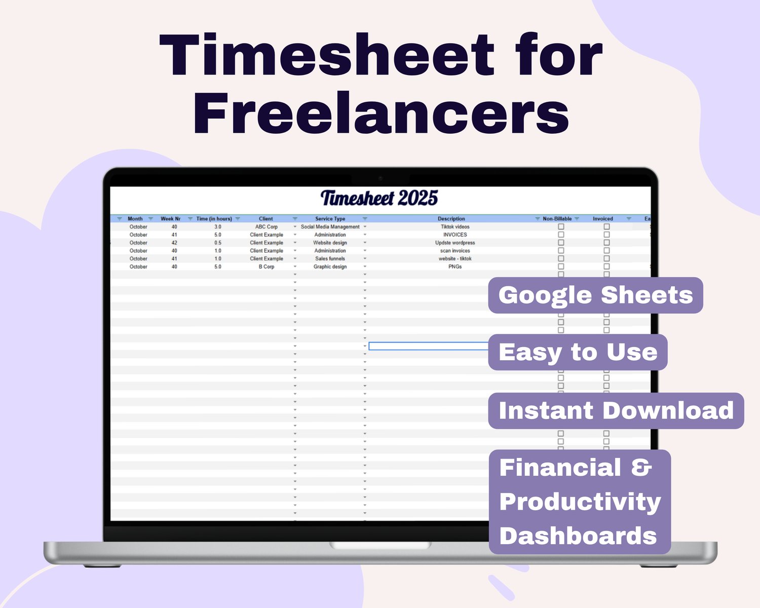 Timesheet Spreadsheet for Freelancers, Google Sheets Time Tracker Template,