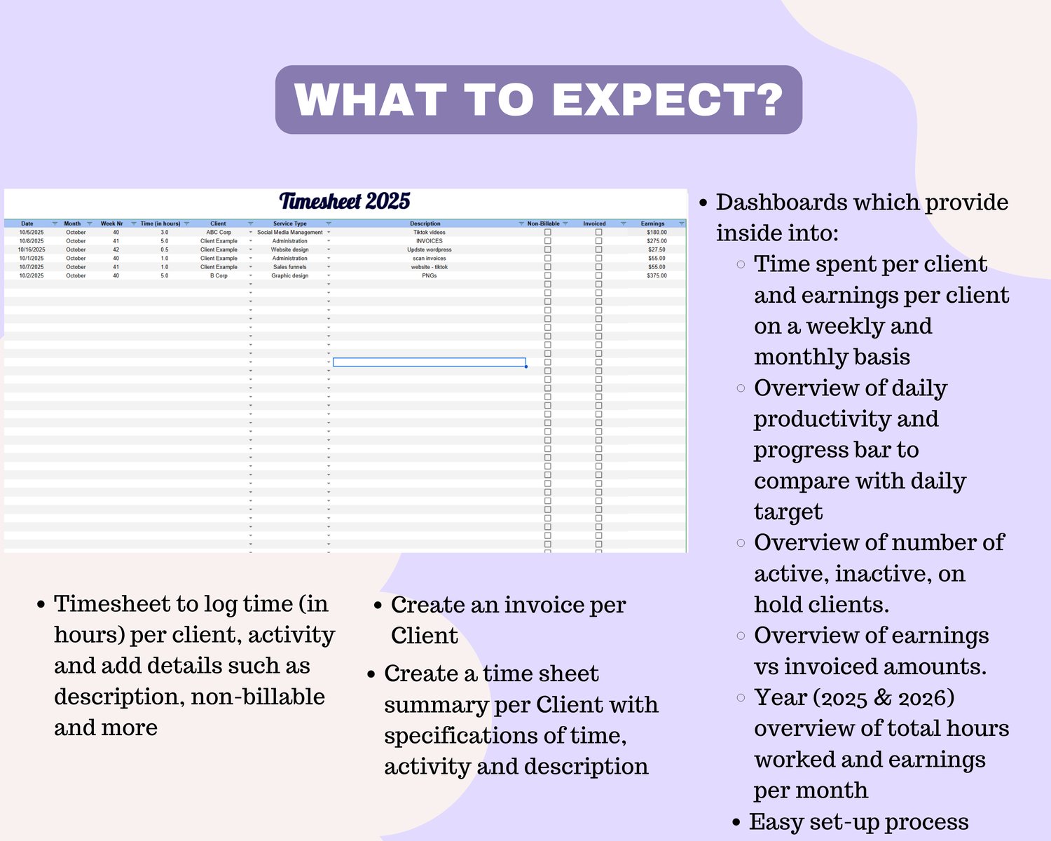 Takes 5-10 minutes. Add your clients, set your rates, and start tracking. Simple setup guide included.