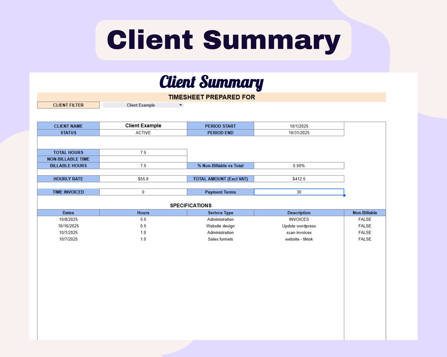 ✅ Client Details Dashboard - Manage multiple clients, rates, projects, and payment terms in one organized sheet