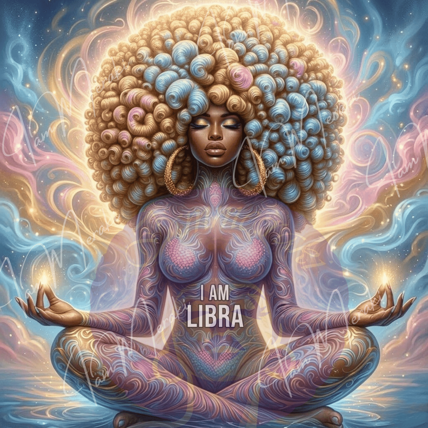 Find your powerful center with the elegant "I Am Libra" Scales Queen digital artwork. Balancing raw confidence with beautiful harmony, this digital diva is draped in intricate symbols of powerful cooperation and aesthetic creation.
