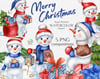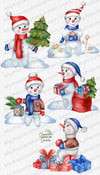 Сute funny snowmen. Сompositions with snowdrifts, gift boxes, Christmas trees, golden stars and a lantern.