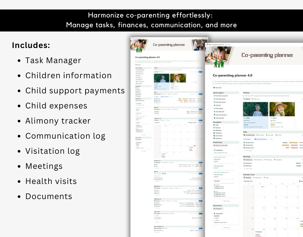 With the Co-Parenting Planner, you’ll spend less time sorting through logistics and more time focusing on what truly matters—your child’s well-being and a more harmonious family life.