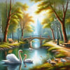 Step into a dreamy fairytale park where graceful swans glide over a tranquil stream, under the soft golden light of a peaceful afternoon. Surrounded by blooming trees and vintage lampposts, this idyllic scene invites serenity and romance. Perfect for nature lovers and fans of storybook-style art. Ideal for prints, cards, journals, and more.
