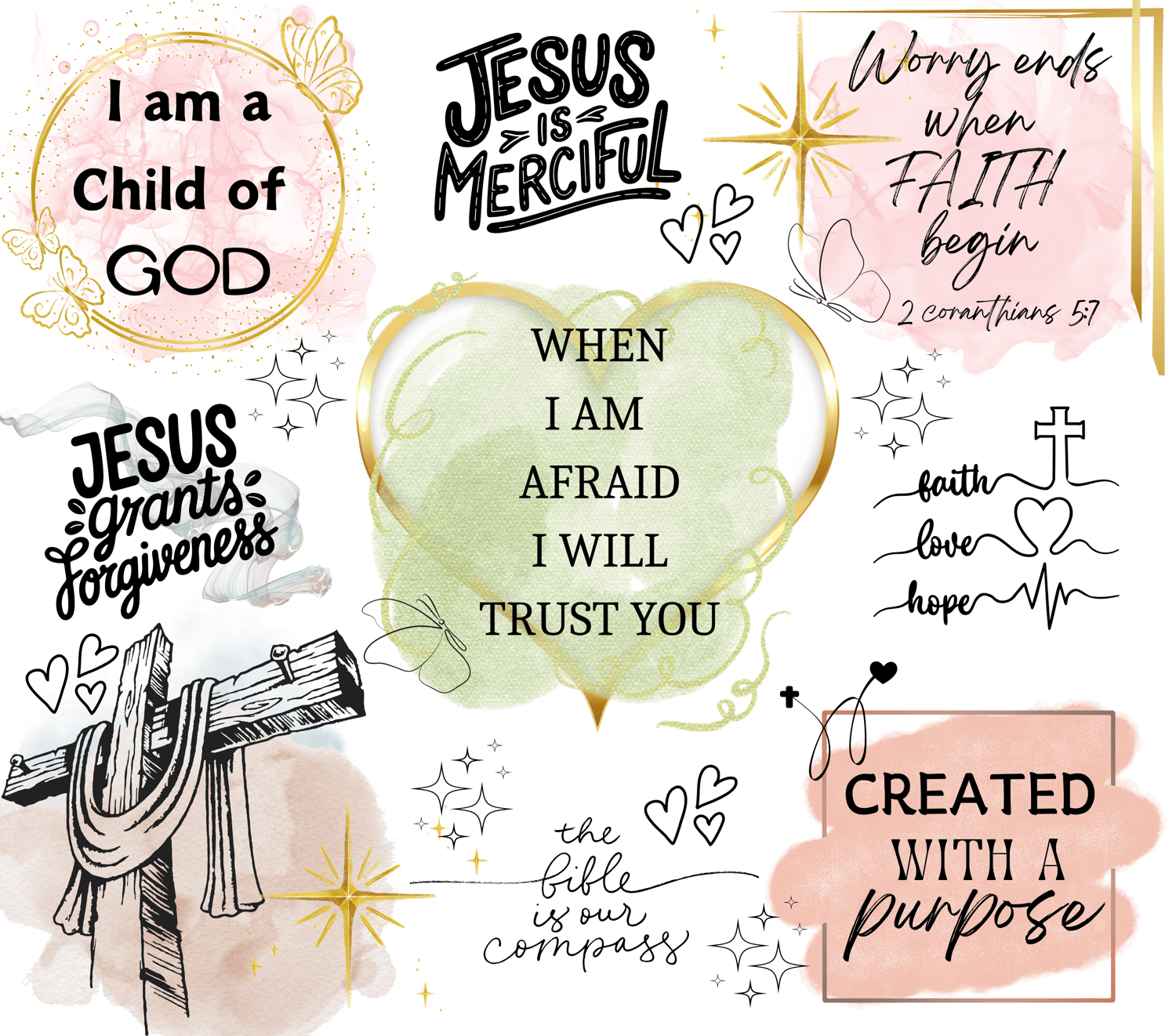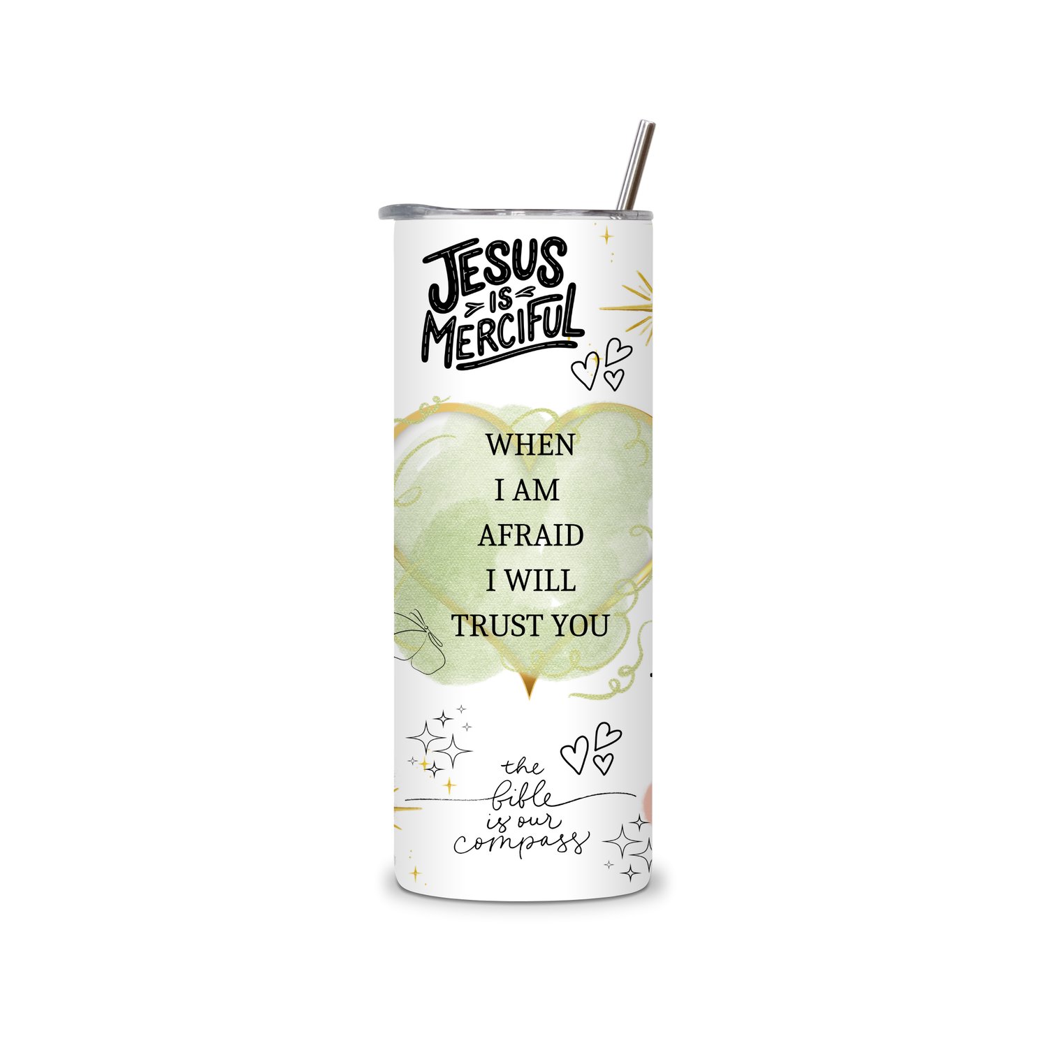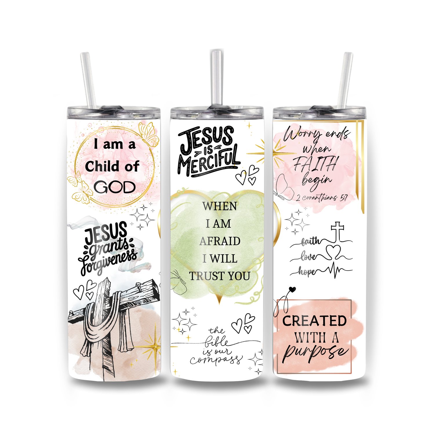 Stay encouraged and uplifted every day with this Christian 20 oz Skinny Tumbler, beautifully designed with soft watercolor tones and powerful faith-filled messages such as I Am a Child of God, Jesus Is Merciful, Created With a Purpose, and When I Am Afraid, I Will Trust You.