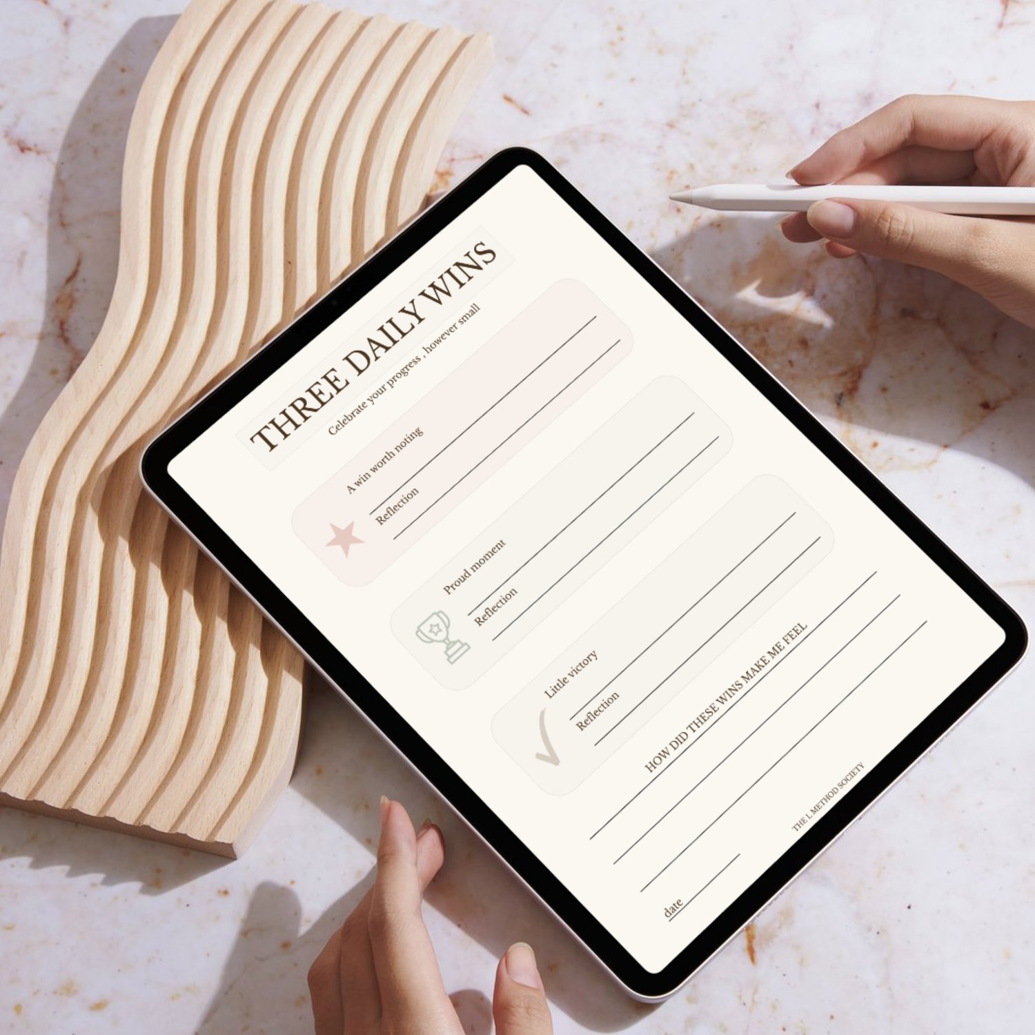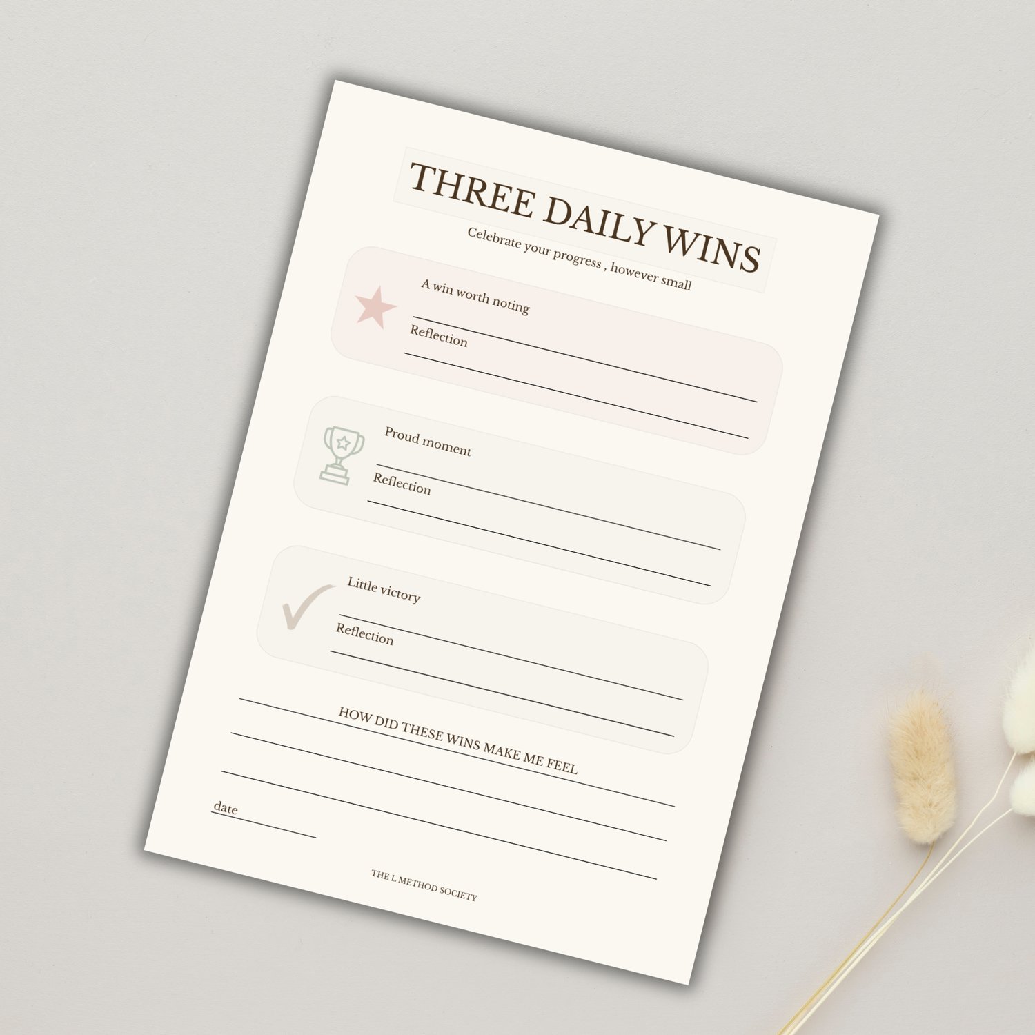 Celebrate progress and boost positivity with the Three Daily Wins template – an editable, printable PDF designed to help you reflect on three wins each day, big or small.