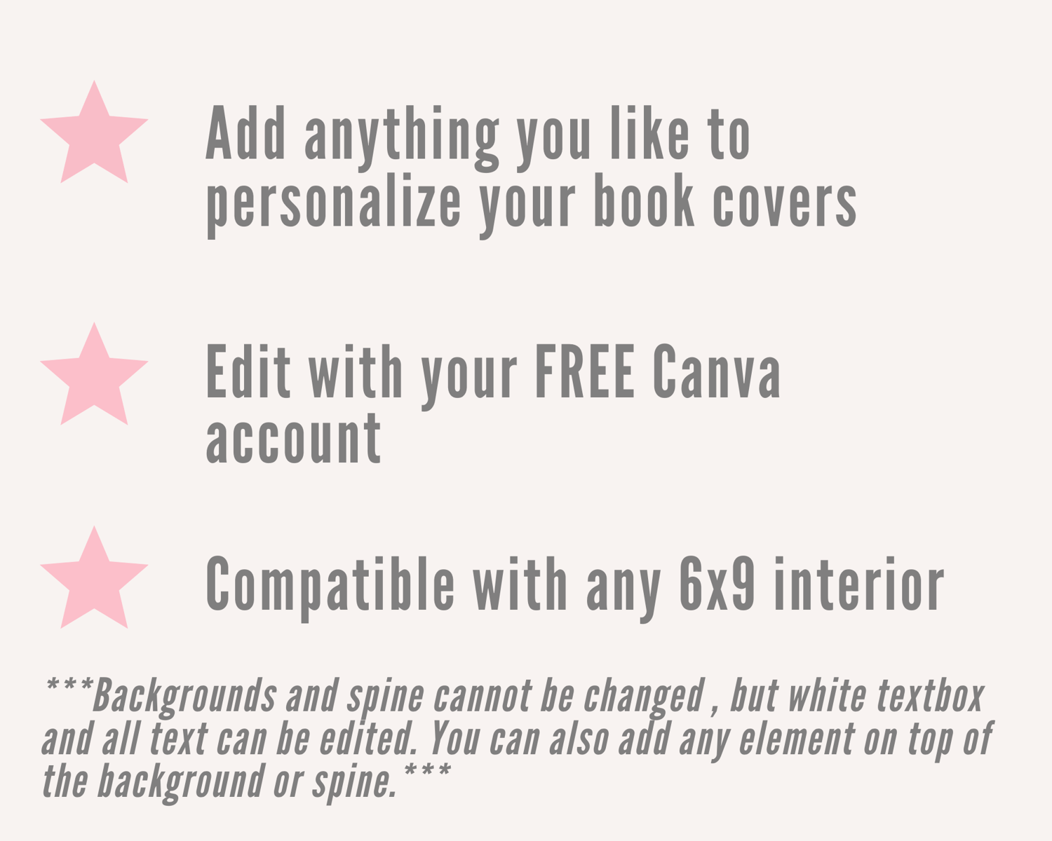 All you have to do is open these templates in Canva, personalize them by adding anything you like on top of the template backgrounds, download your designs as high-quality print PDF's, and upload your designs along with your own 6x9 interiors to your KDP dashboard. Easy peasy.