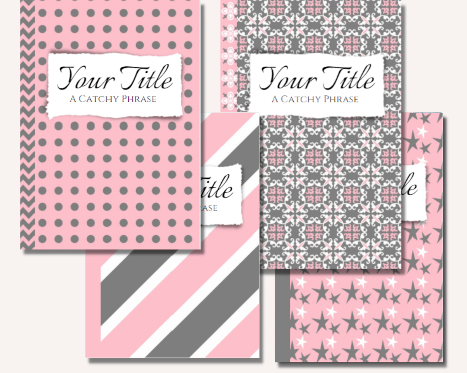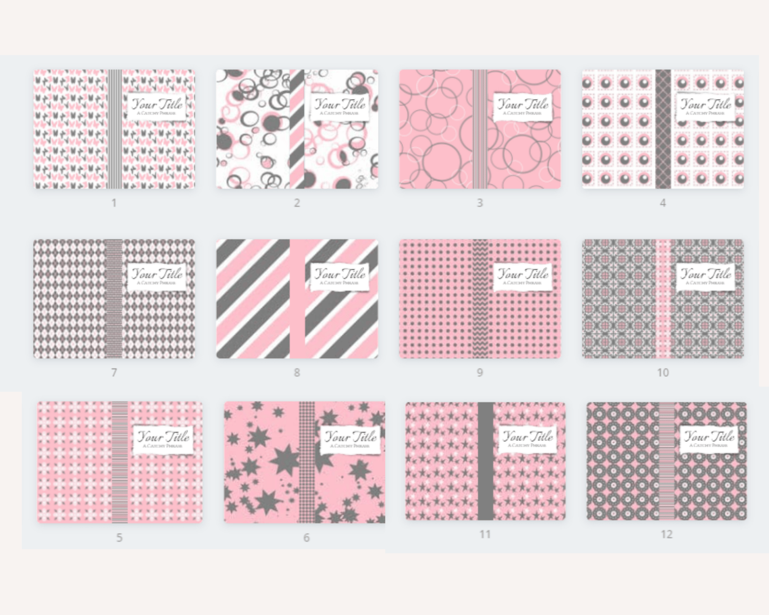 Get 12 beautiful Amazon KDP Book cover templates that you can personalize and make your own in a free Canva account. Pink and gray patterned theme.