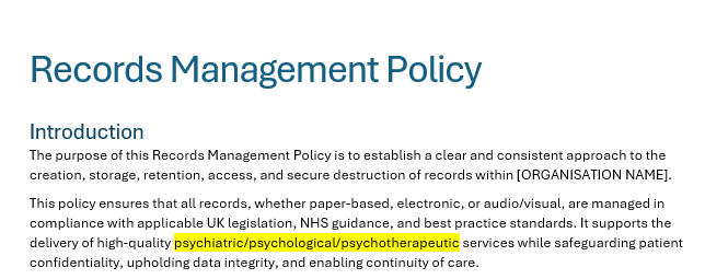 This is a template Records Management Policy designed to cover most small autism/ADHD assessment and ADHD medication management services. It is designed to be compliant with NHS requirements.