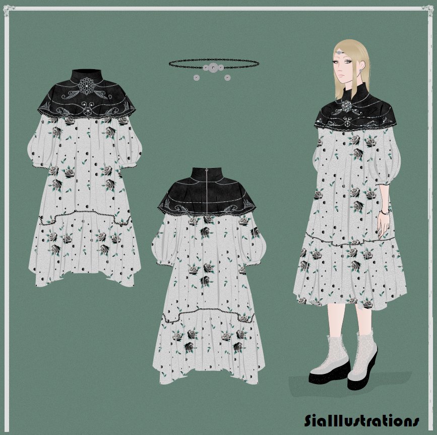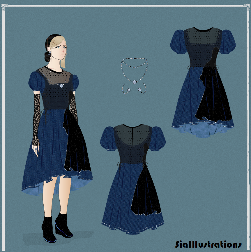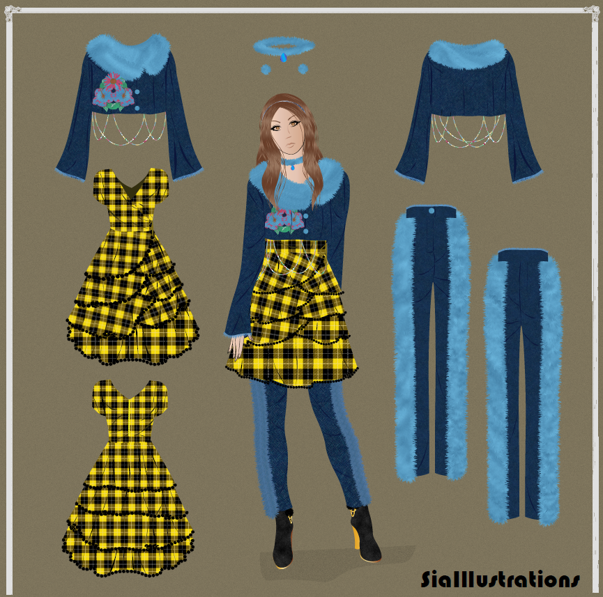 Level up your fashion wardrobe!!! "Autumn Casual Fashion Illustration Denim Edition Pt. 2" bring three new pieces for your wardrobe. The first outfit is blue soft fur asymmetrical collar floral denim crop top with long bell style sleeves together with fur long straight pants. Add a yellow/black plaid layered short dress to complete the look. The second outfit is a turtle black denim neckline with crystal embroidery and long baggy floral white dress. Finally, the third outfit is a lace upper fabric with a deep rectangle neckline knee-length blue denim ruffle dress and short puffed style sleeves. The illustration is present in high quality with front and back view of each garment both in PDF and PNG format.
