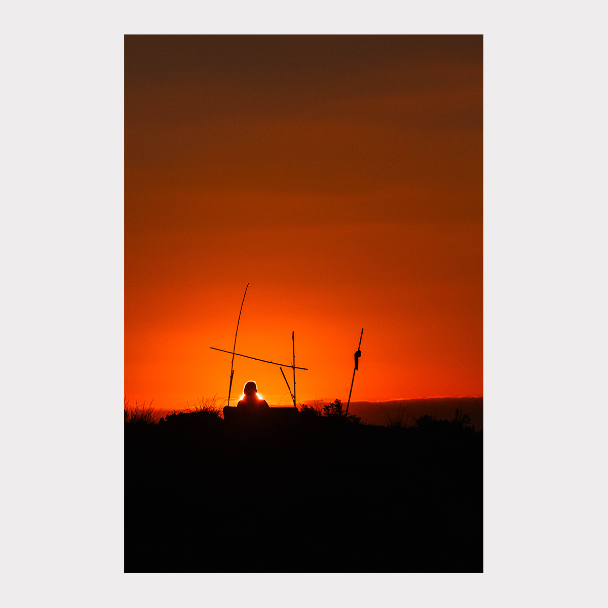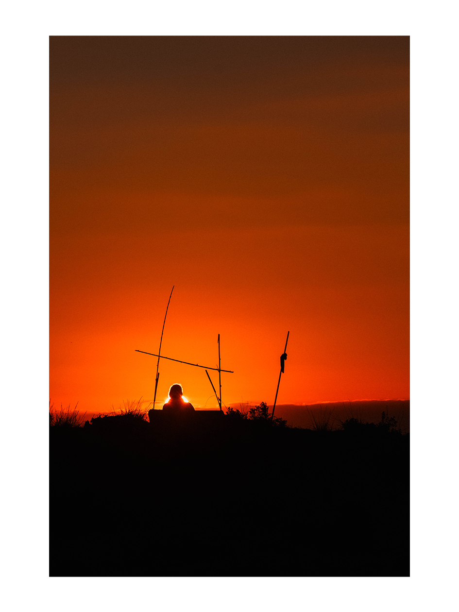 Chaque soir, le coucher de soleil devenait un rendez-vous presque sacré. Nous nous retrouvions face à la mer pour observer la transition silencieuse entre le jour et la nuit. Sur cette image, une personne est assise de dos sur un banc de bambou, plongée dans l’obscurité du premier plan. Aligné parfaitement derrière sa tête, le soleil disparaît lentement à l’horizon, baignant la mer d’une lumière douce d’hiver.
