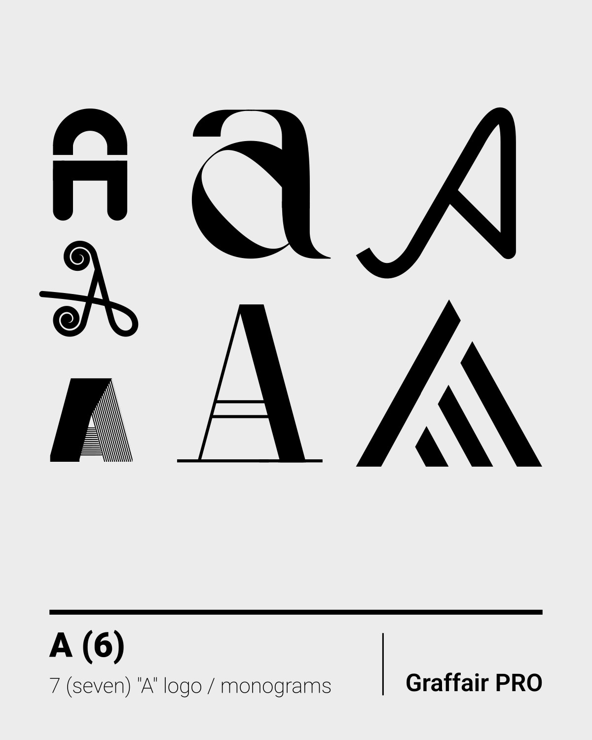 A (6) Monograms: The sixth set of 7 (seven) A's logo monograms, out of 84 ones, that you can find amongst the "1050 SVG Monograms" super package, which comes with an Index catalog.