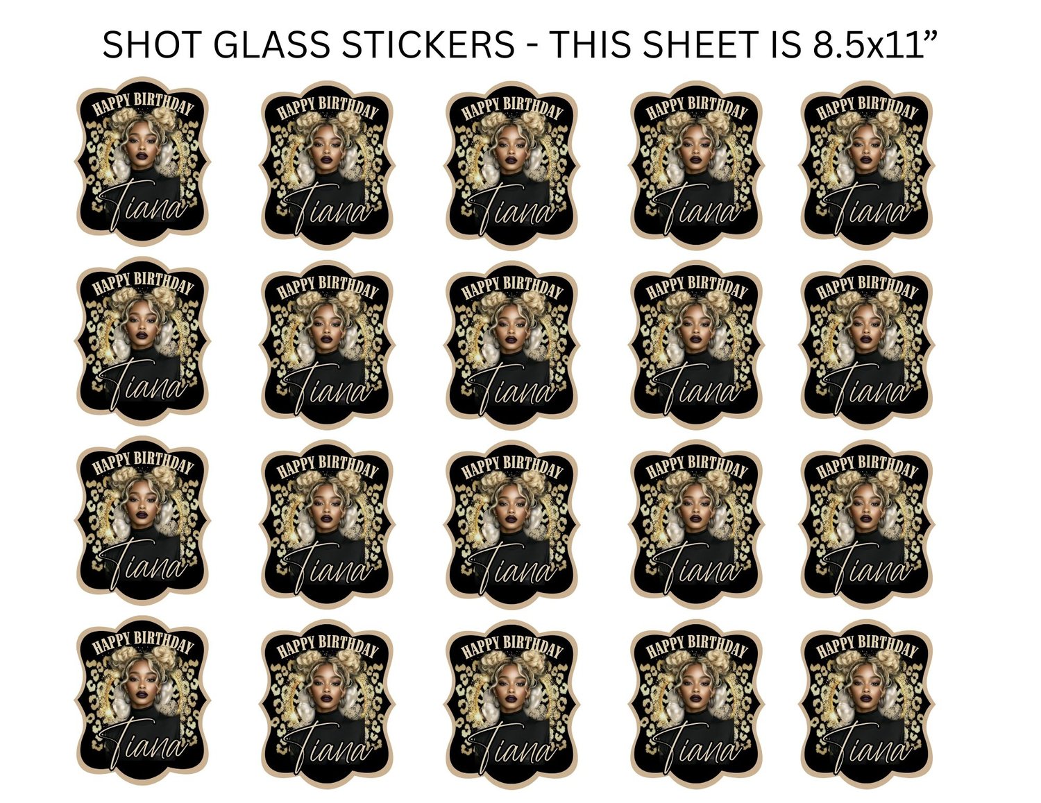20-Pack Shot Glass Stickers: A full 8.5" x 11" sheet with 20 individual stickers for custom shot glass favors.