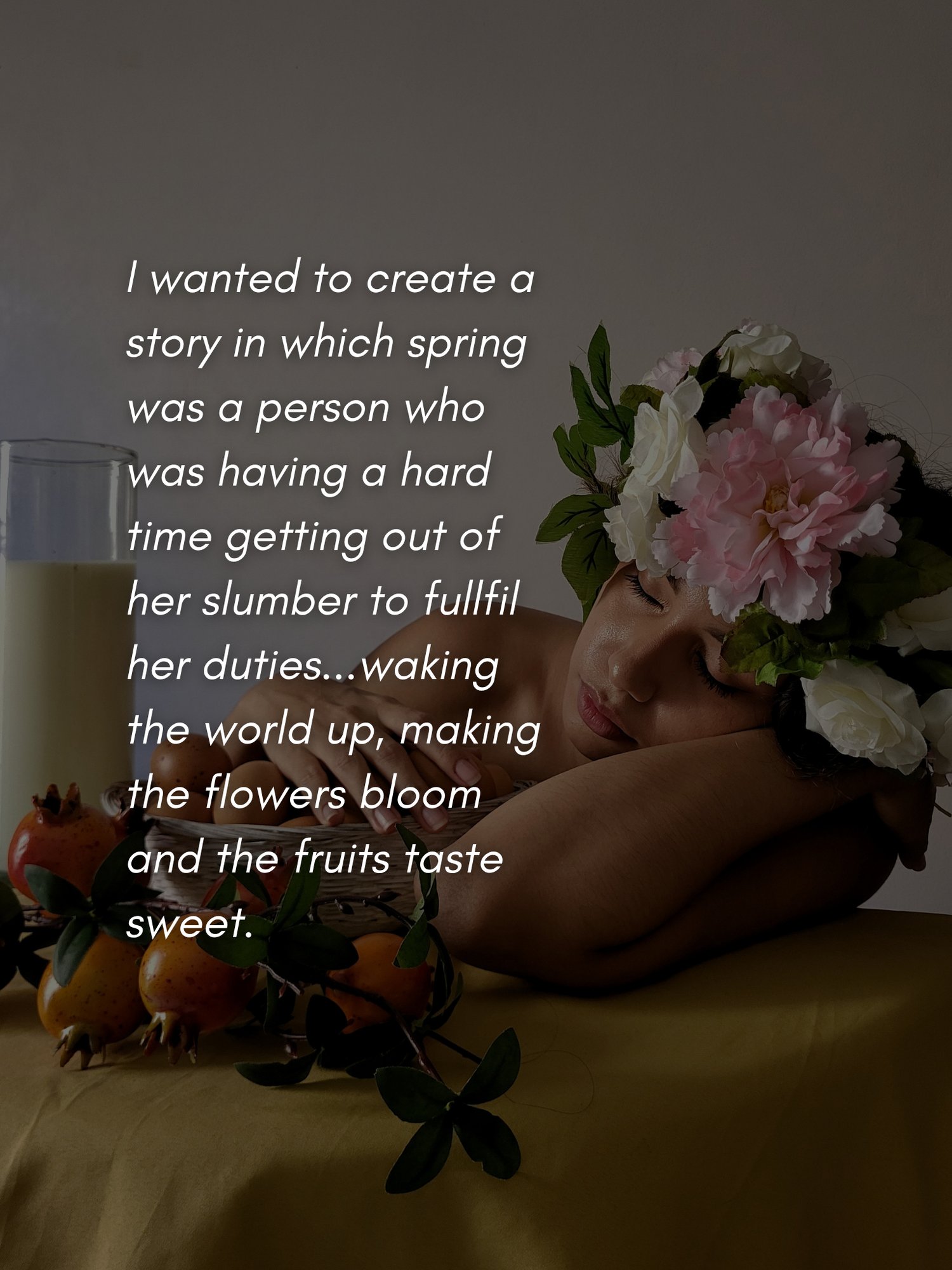 I wanted to create a story in which spring was a person who was having a hard time getting out of her slumber to fullfil her duties...waking the world up, making the flowers bloom and the fruits taste sweet.As always I hope my work inspires your art💐