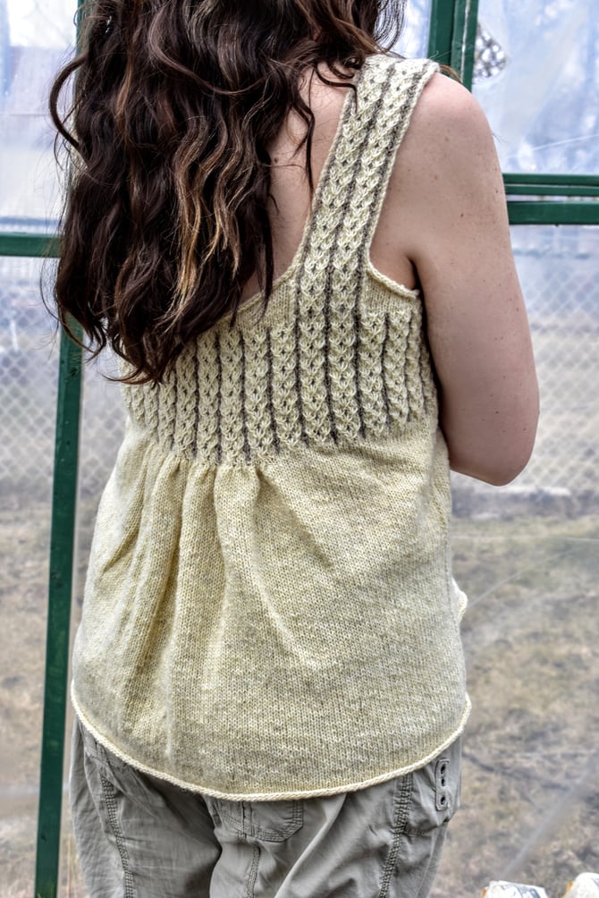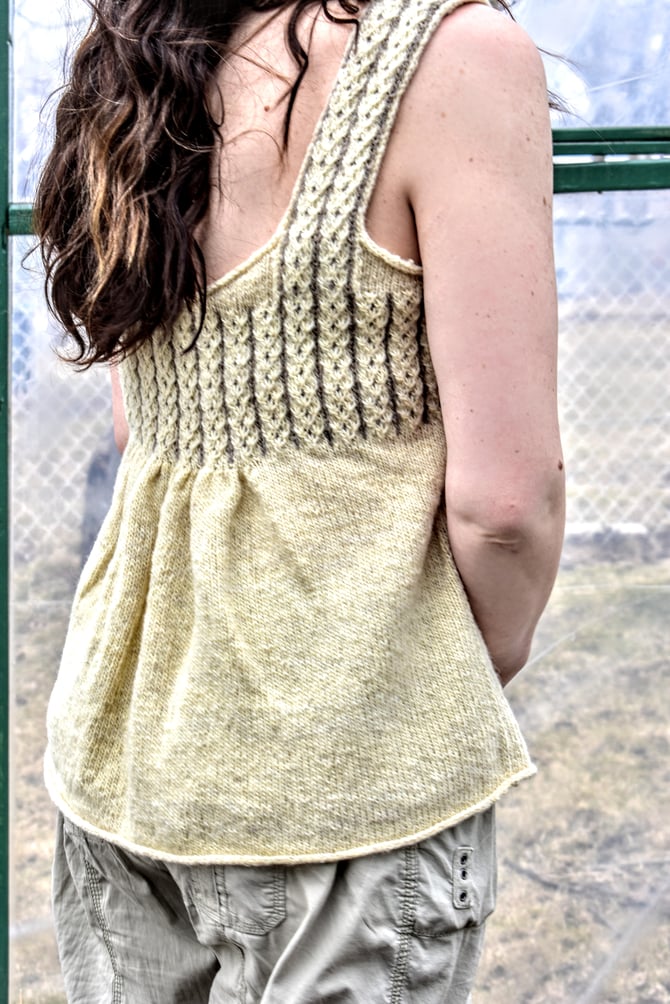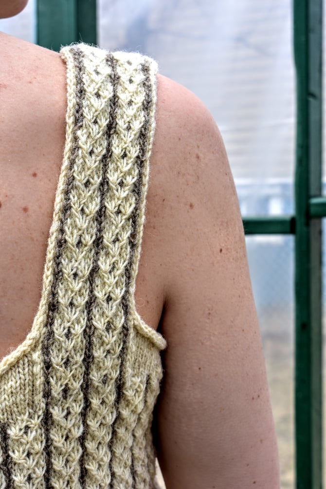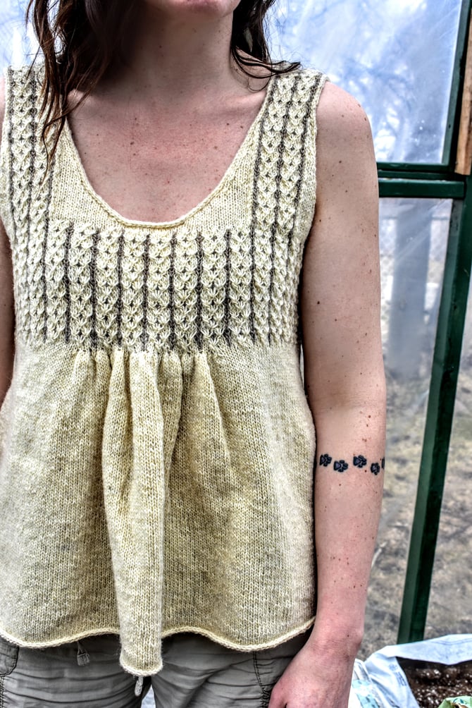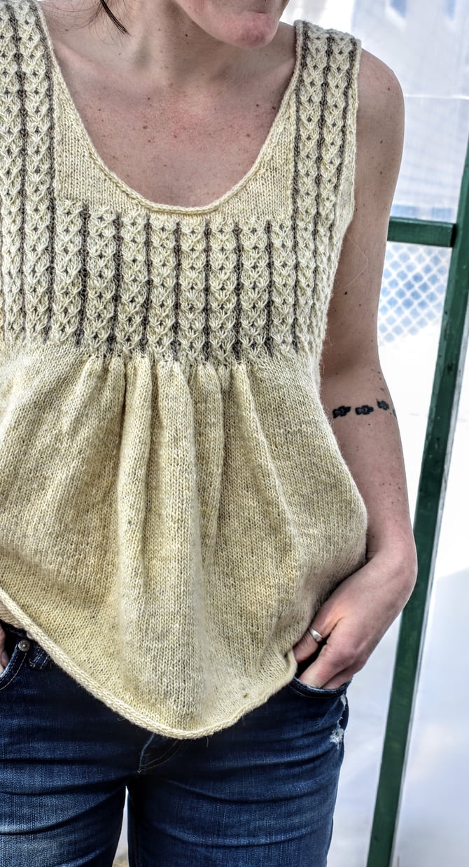 Twillingate is a bottom up, easy and breezy tank top for wool lovers on warm and sunny days. The textured colourwork is strong but delicate. The stockinette body is very airy and loose, and gathered at the bust as a feminine highlight. A wool top for warm weather…but just because it’s a tank top, it doesn’t mean that you can’t wear it under and over other things on cold days too!