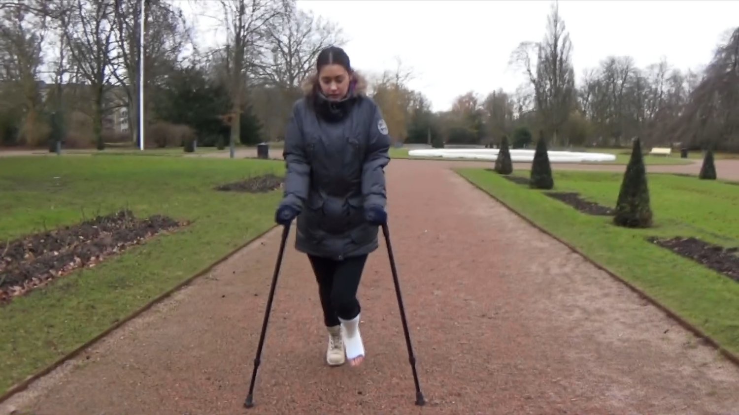 Elisabeth is crutching in the park with a white SLC on her left leg.On her walk she must crutch up some steps but of course is that no problem for a pro crutcher like Elisabeth.We get some closeup of her cast when Elisabeth sits down to put on a white sock over her now cold toes.