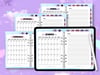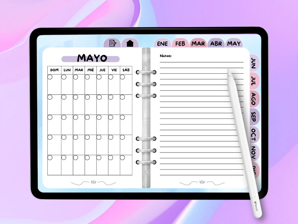 Agenda, organizador, anotador digital de color lila en español utilizable en cualquier año.