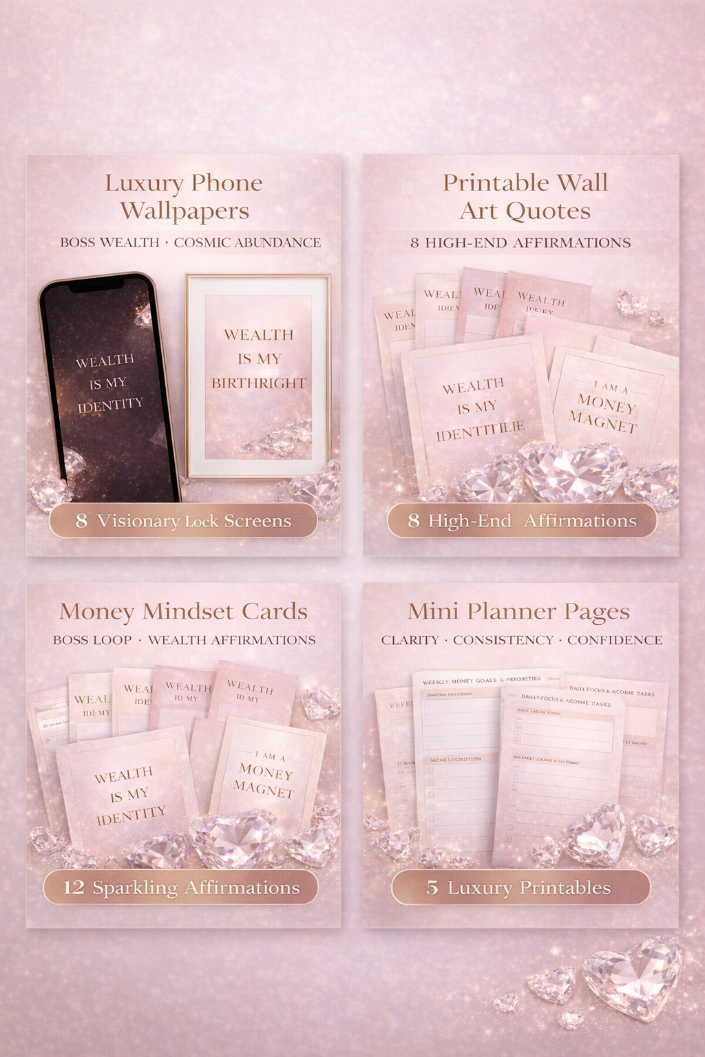 Short, punchy affirmations designed with floating diamonds, soft money elements, and calm luxury aesthetics.