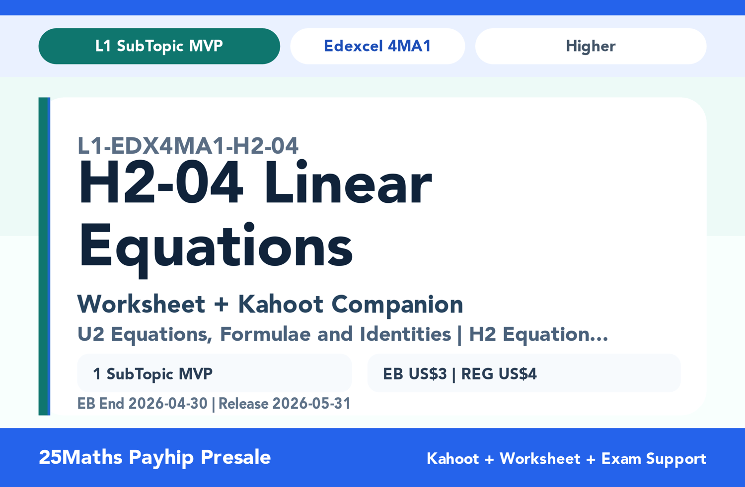 Master Linear Equations for your Edexcel 4MA1 Higher Exam with our Interactive Practice Suite! Whether you're a student aiming for higher marks or a teacher seeking engaging classroom resources, this worksheet and Kahoot combo is directly aligned with the official Edexcel syllabus.