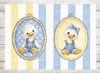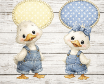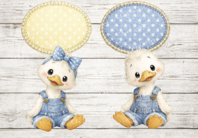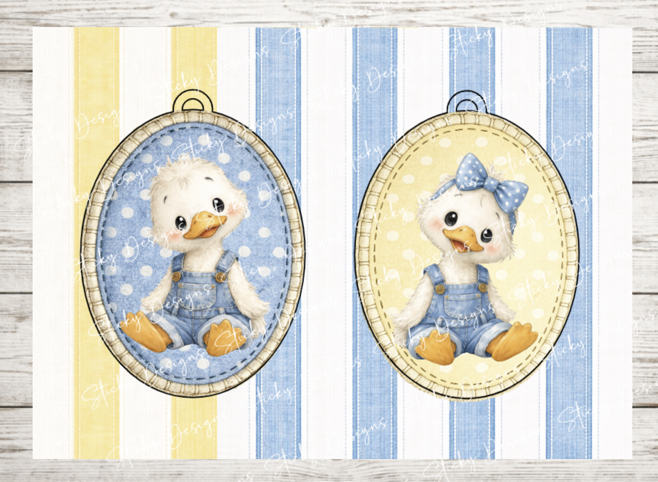 Cute duck design 2 standing ducks and 2 sitting ducks 2 designs on the hanging oval acrylic shape from Woodform Crafts product No WC2386 2 oval shapes, blue polka dot and yellow polka dot and 2 backing paper yellow and white stripes and blue and white stripes.... Lots of items that this would be able to go on.
