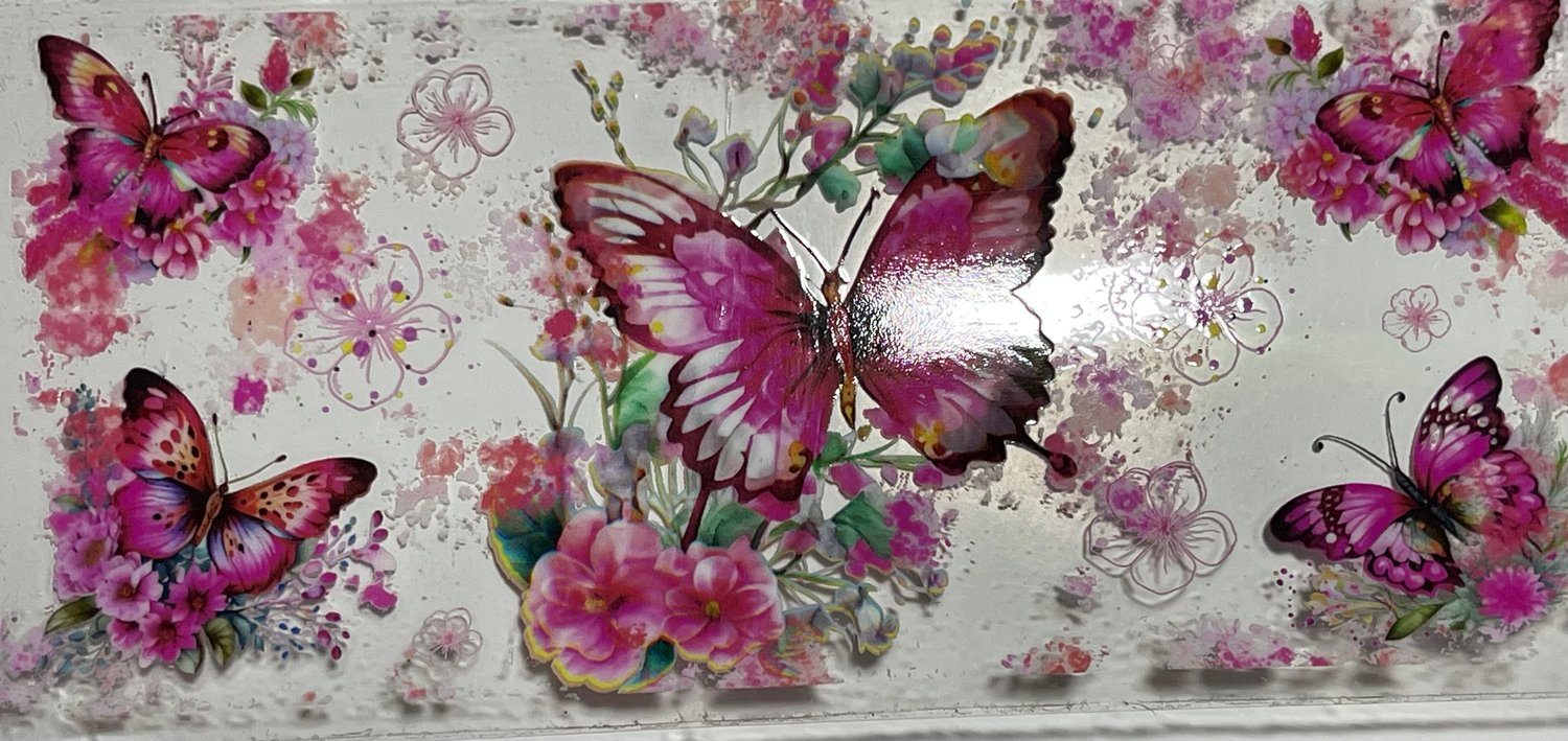 Add a soft, elegant touch to your drinkware with this Pink Butterfly UV DTF Cup Wrap