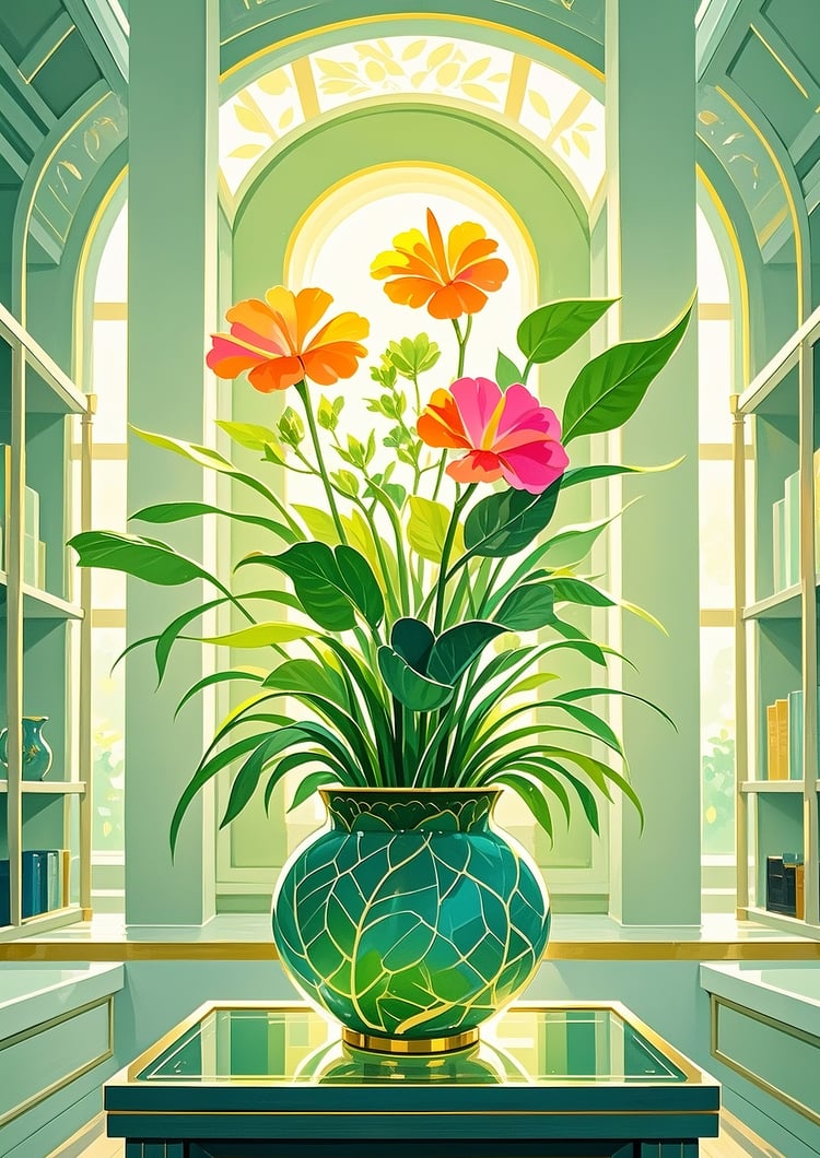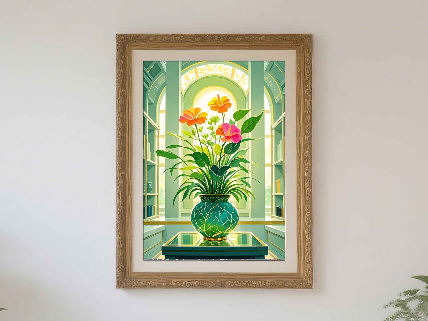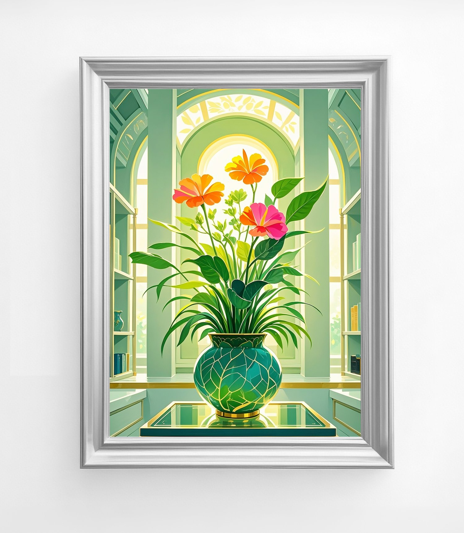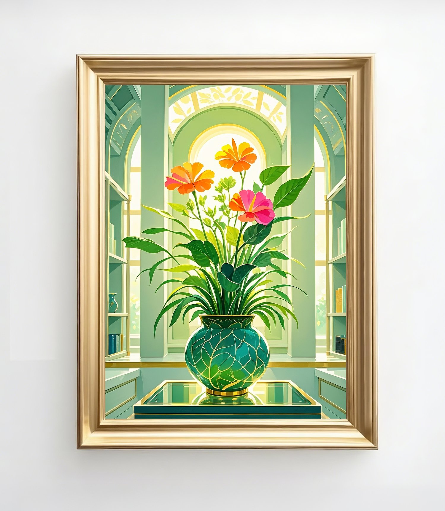 This artwork captures the beauty of vibrant flowers glowing in soft sunlight, presented in a turquoise vase with a sophisticated geometric pattern. The warm orange and pink blossoms create a radiant contrast, filling the room with both brightness and serenity. Perfect for living rooms, offices, or entryways, this piece brings a modern yet timeless elegance to any space.