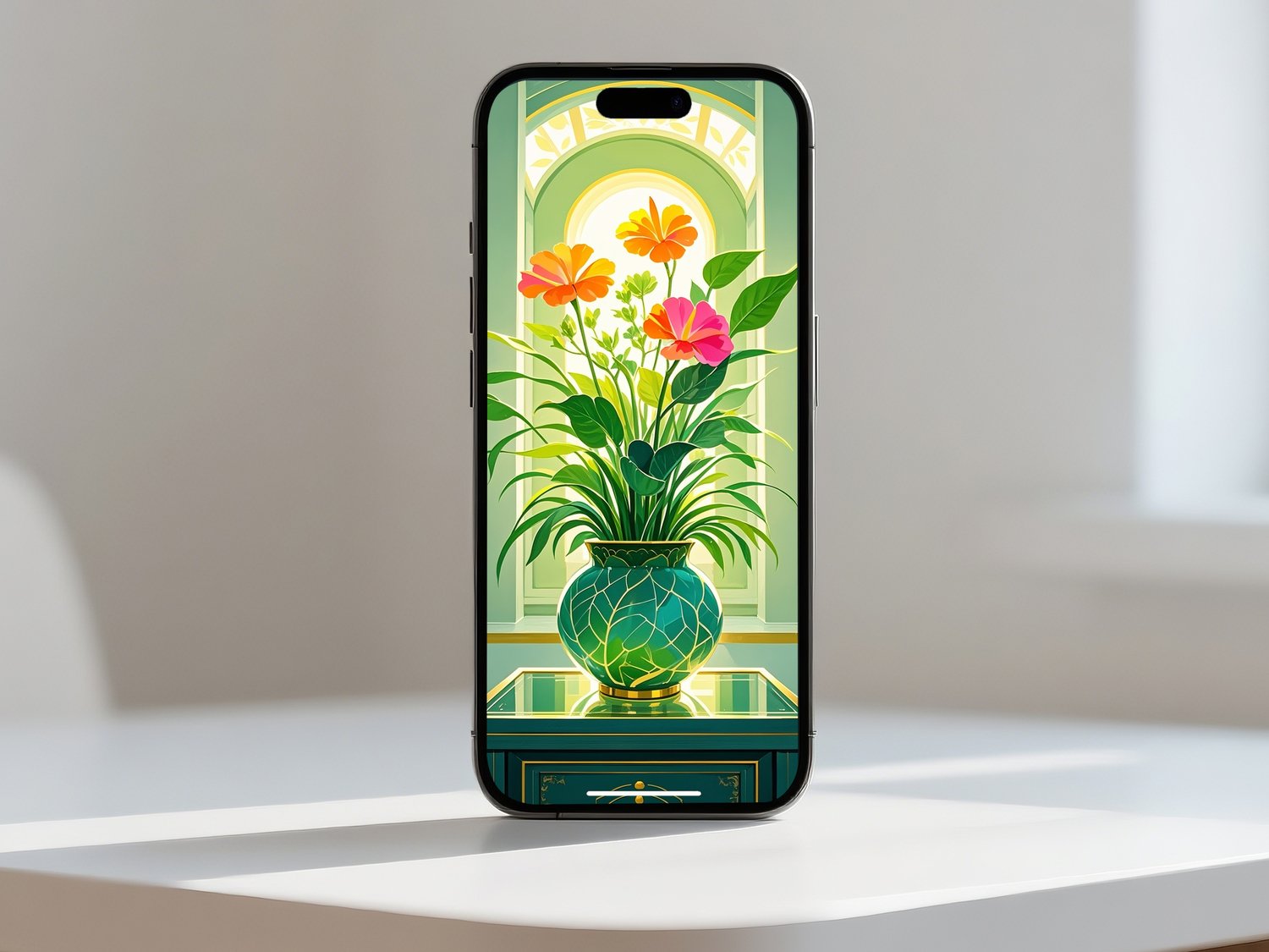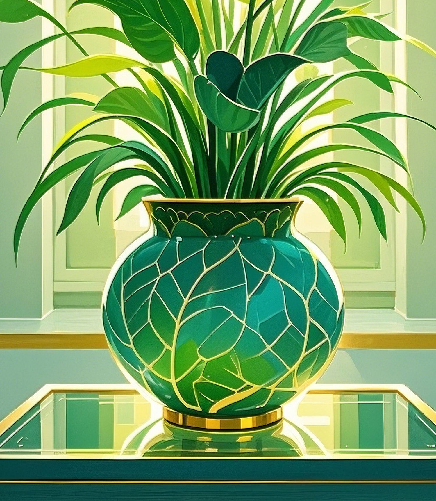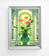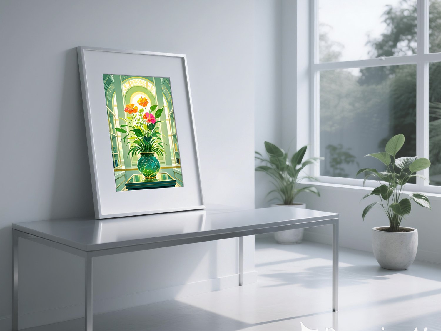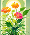 This artwork captures the beauty of vibrant flowers glowing in soft sunlight, presented in a turquoise vase with a sophisticated geometric pattern. The warm orange and pink blossoms create a radiant contrast, filling the room with both brightness and serenity. Perfect for living rooms, offices, or entryways, this piece brings a modern yet timeless elegance to any space.